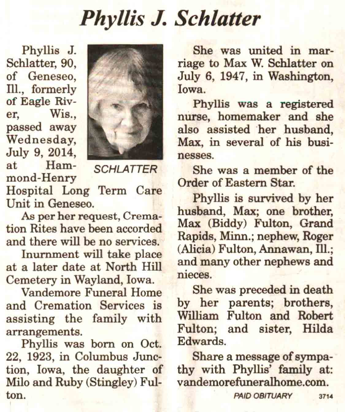 | Schlatter | Phyllis J (Fulton) | 22 Oct 1923 | 09 Jul 2014 | V N-R | 16 Jul 2014 | 4A |