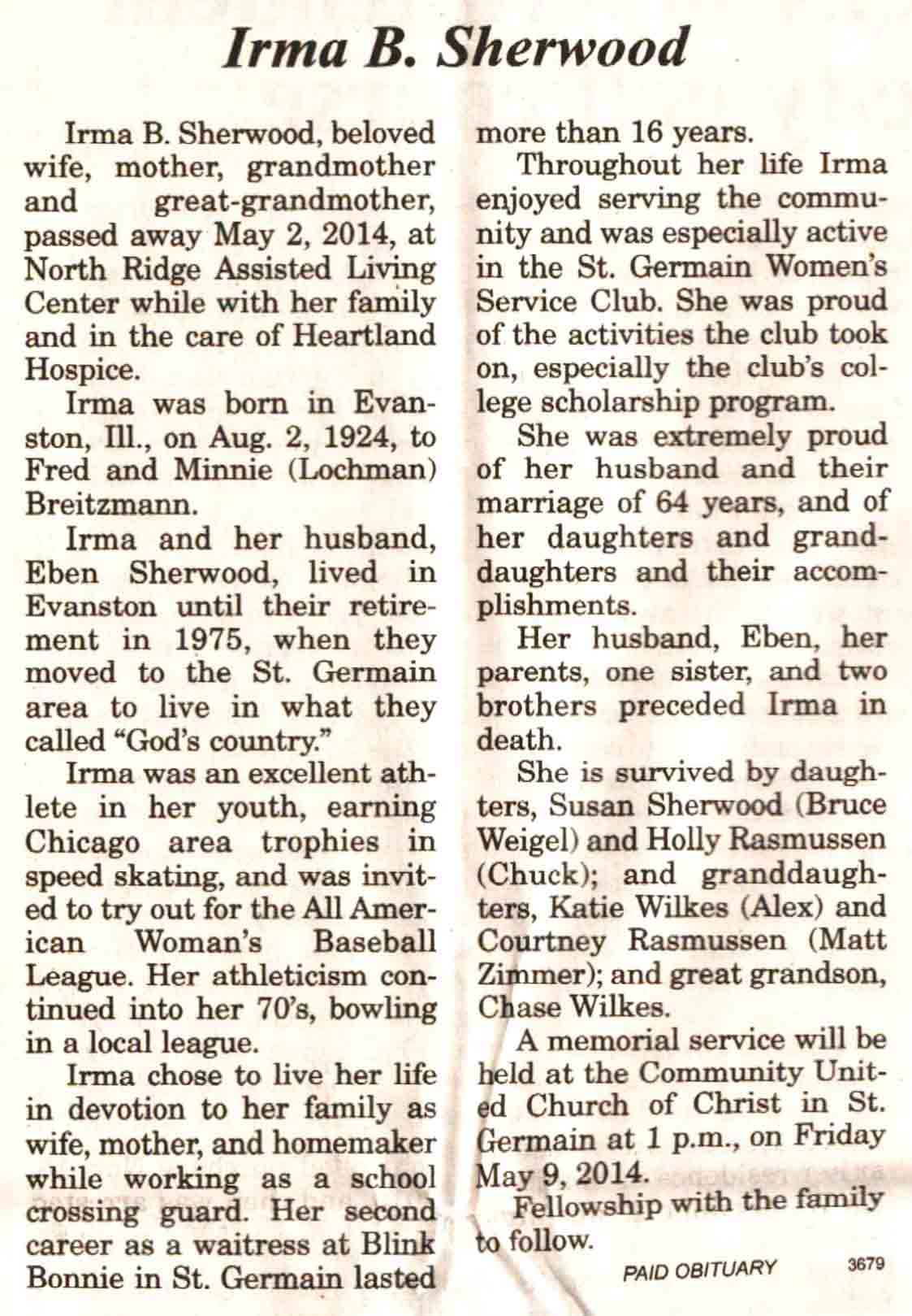 | Sherwood | Irma B (Breitzmann) | 02 Aug 1924 | 02 May 2014 | V N-R | 07 May 2014 | 4A |