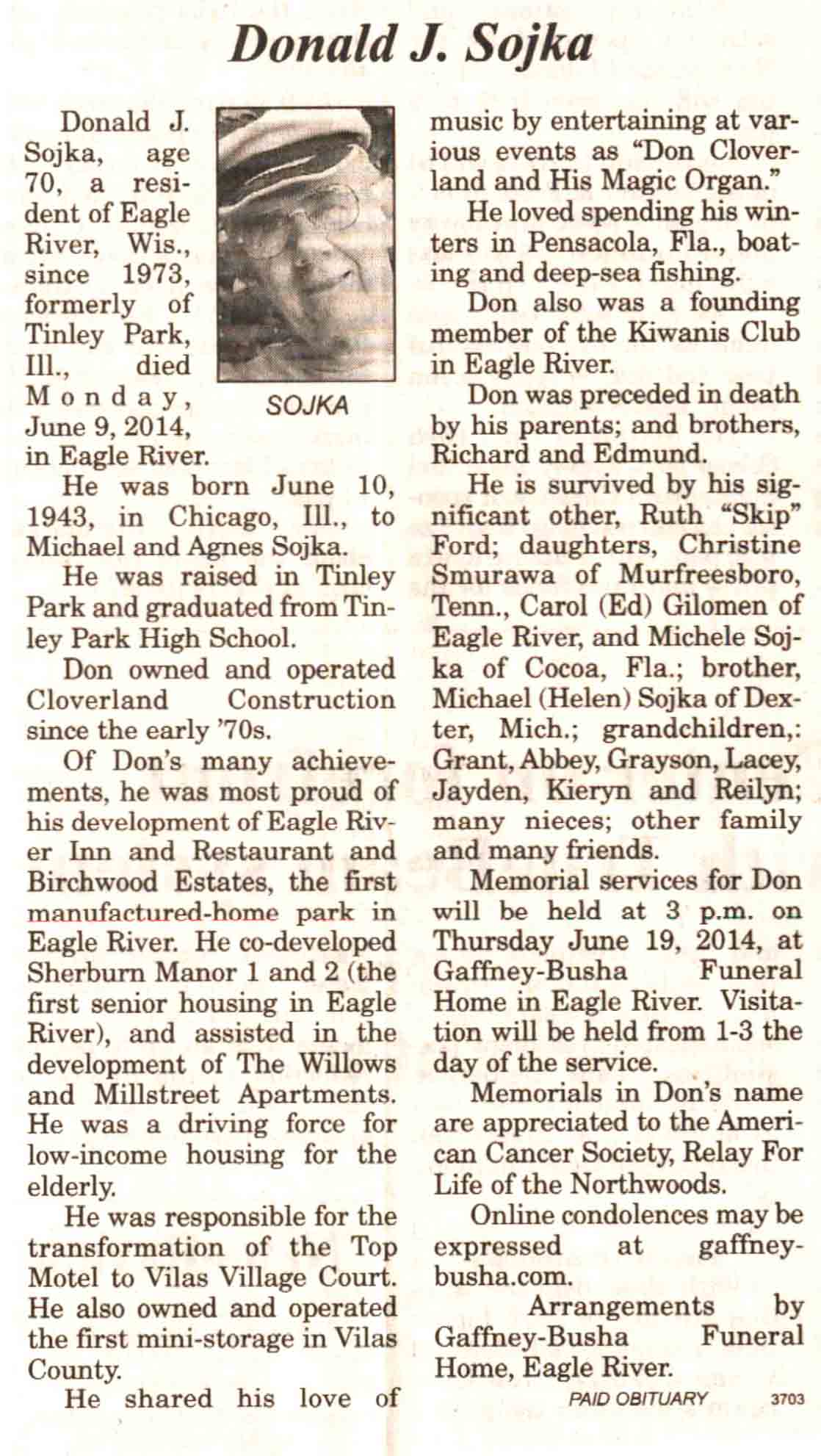 | Sojka | Donald J | 10 Jun 1943 | 09 Jun 2014 | V N-R | 18 Jun 2014 | 4A |