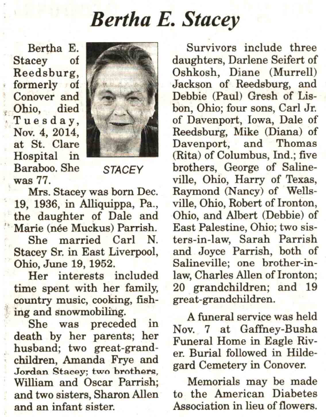 | Stacey | Bertha E (Parrish) | 19 Dec 1936 | 04 Nov 2014 | V N-R | 12 Nov 2014 | 4 |