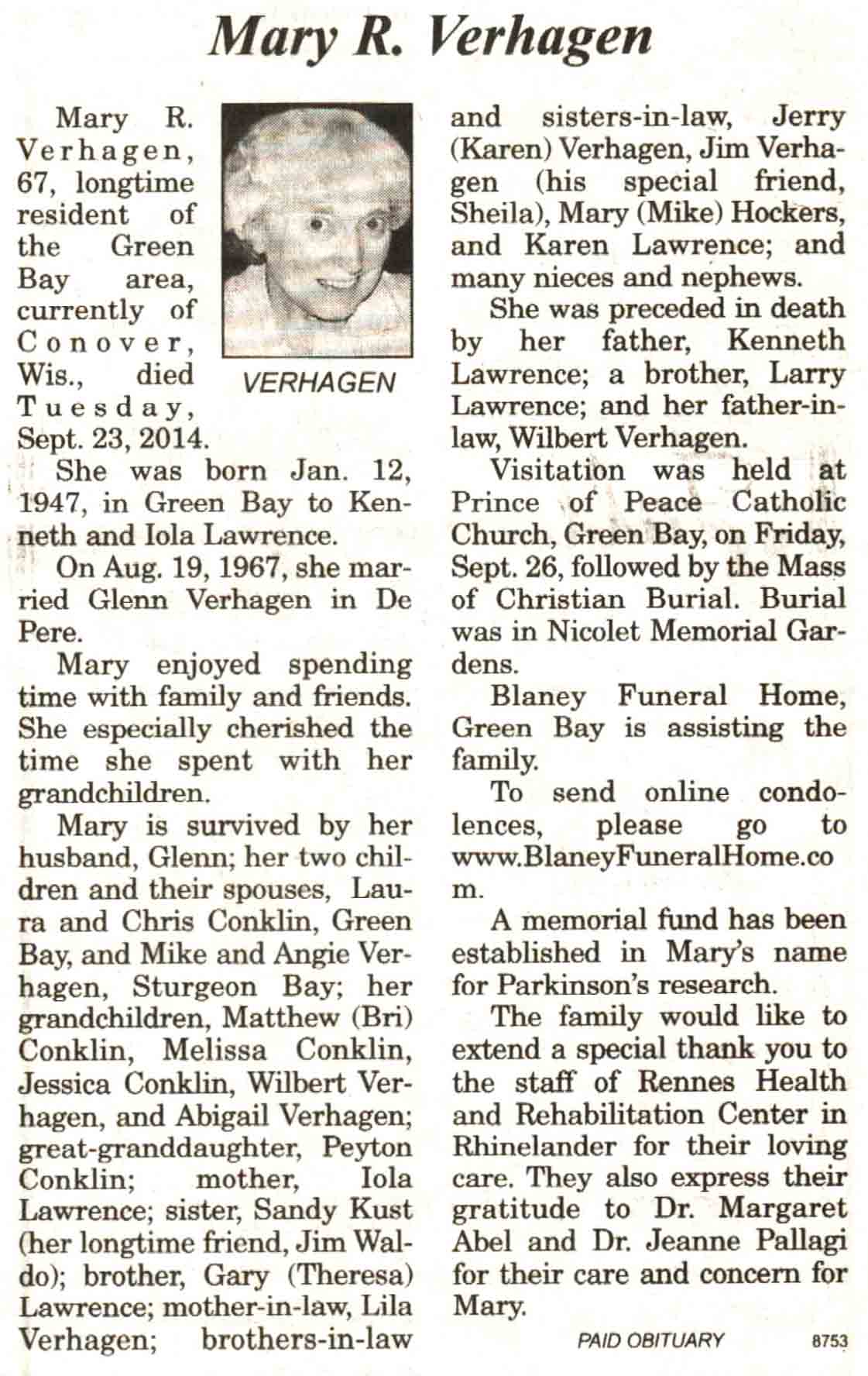 | Verhagen | Mary R (Lawrence) | 12 Jan 1947 | 23 Sep 2014 | V N-R | 01 Oct 2014 | 4A |