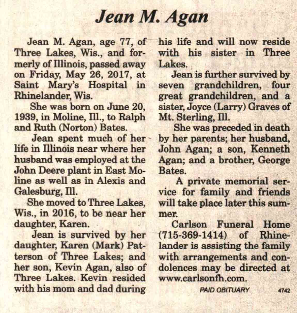 | Agan | Jean M (Bates) | 20 Jun 1939 | 26 May 2017 | V N-R | 07 Jun 2017 | 4A |