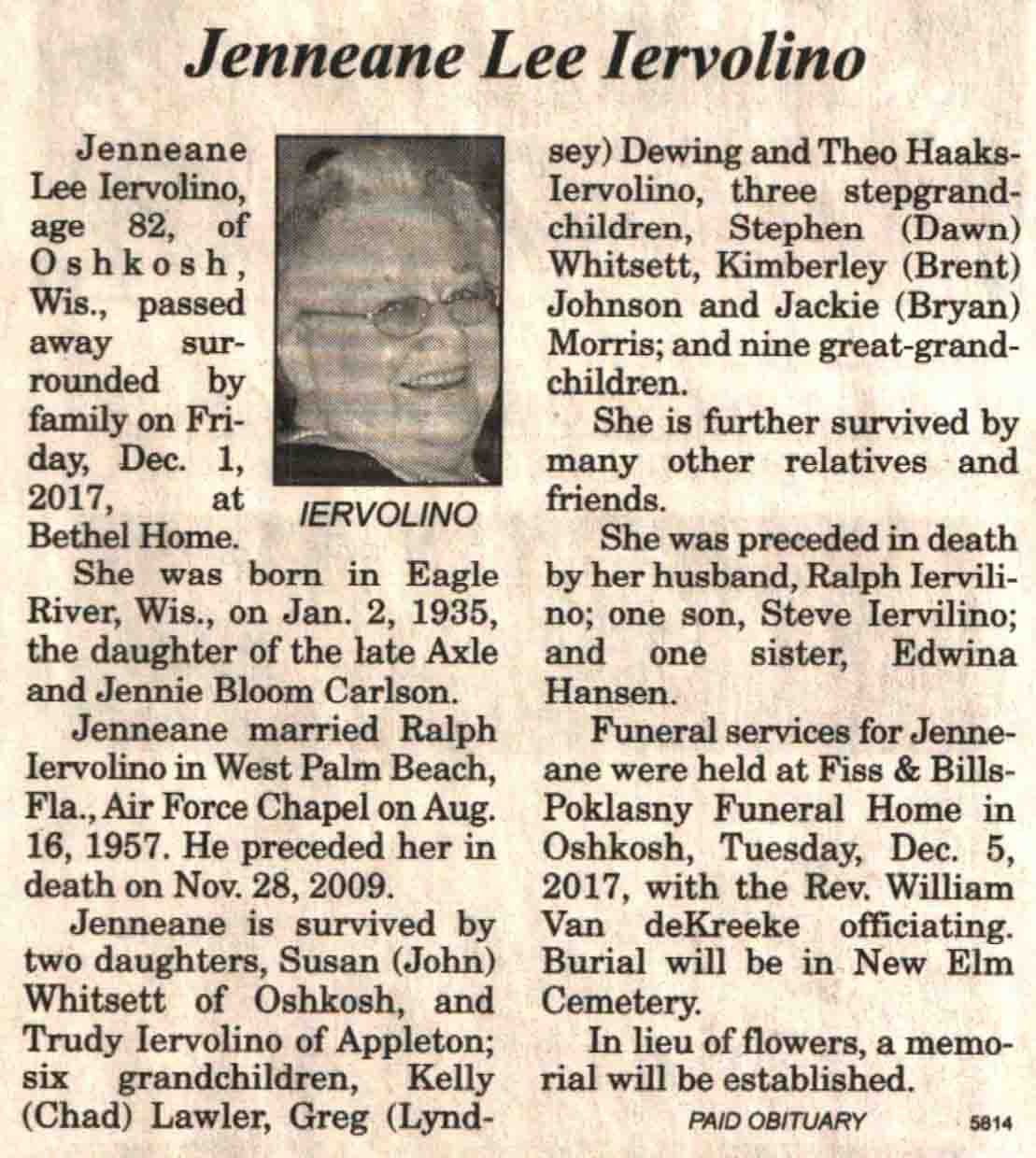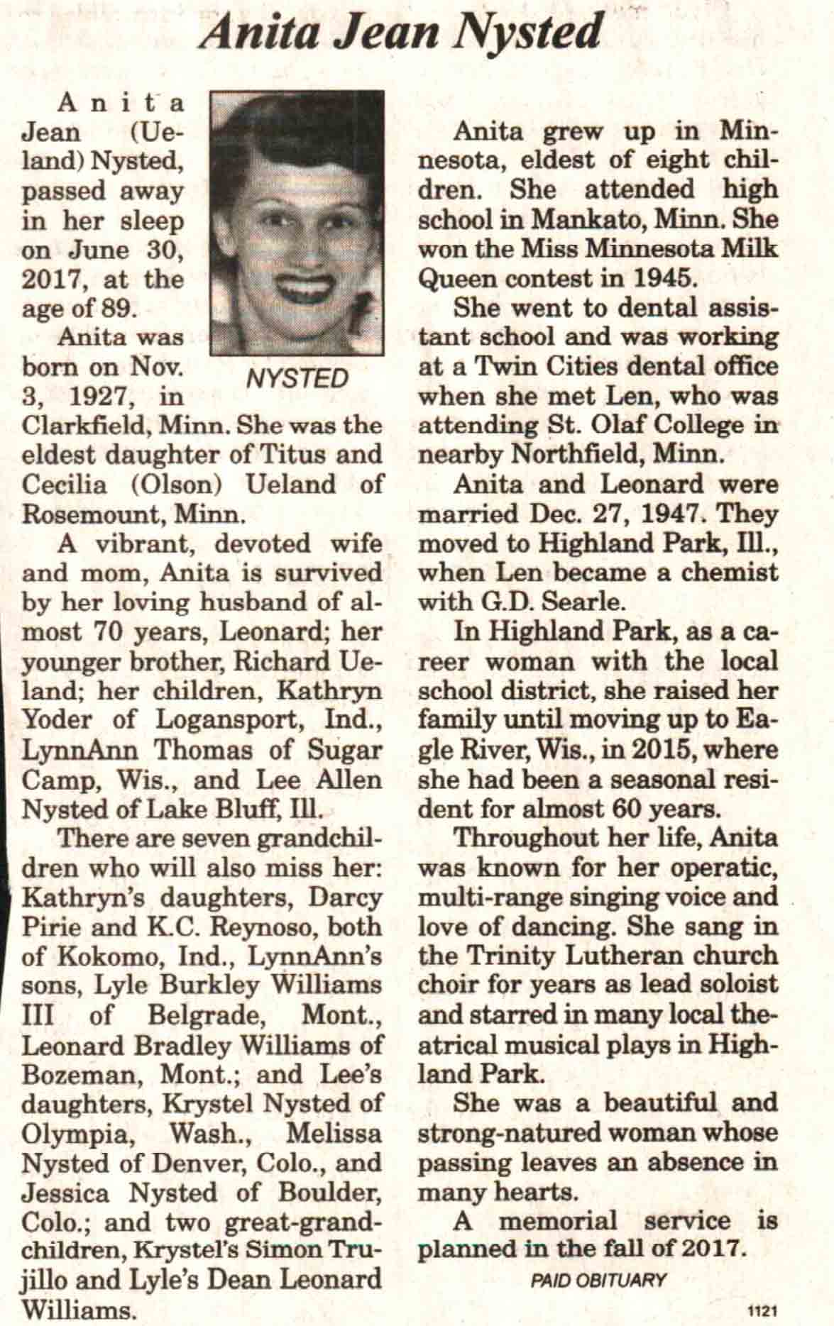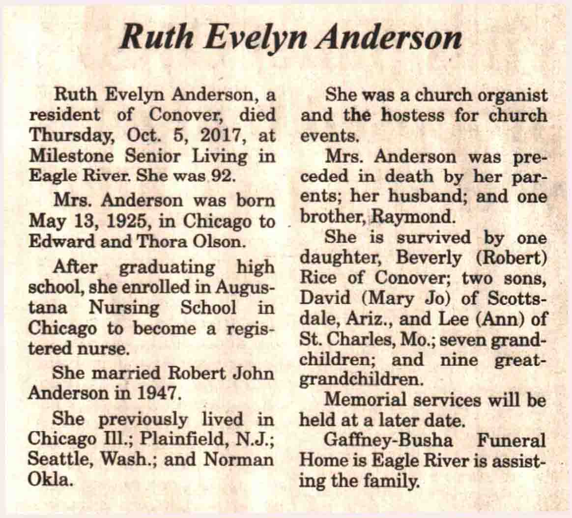 | Anderson | Ruth Evelyn (Olson) | 13 May 1925 | 05 Oct 2017 | V N-R | 11 Oct 2017 | 4A |