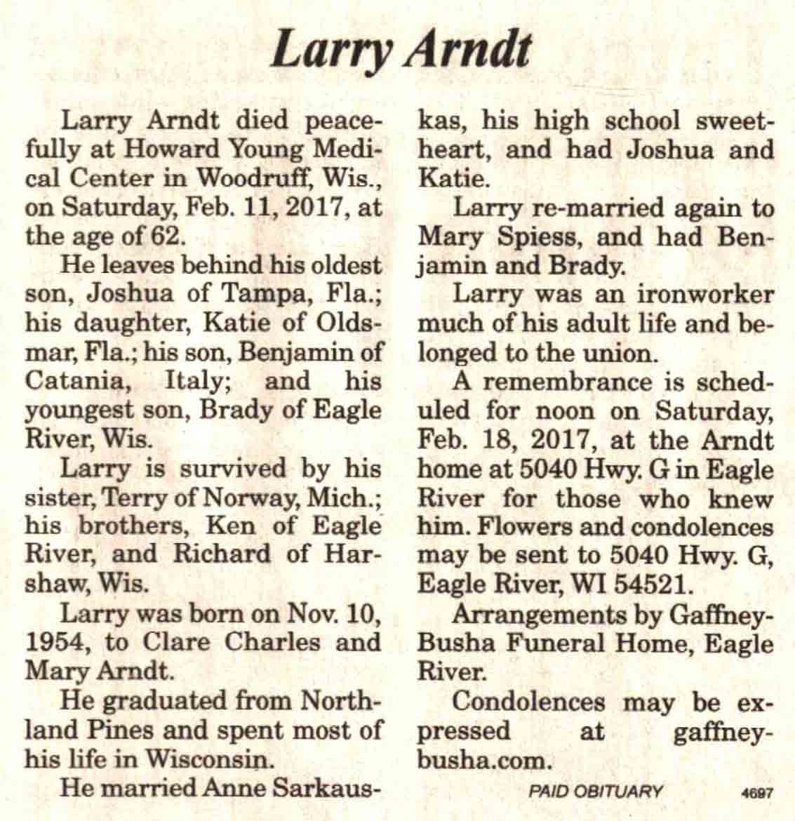| Arndt | Larry | 10 Nov 1954 | 11 Feb 2017 | V N-R | 15 Feb 2017 | 4 |