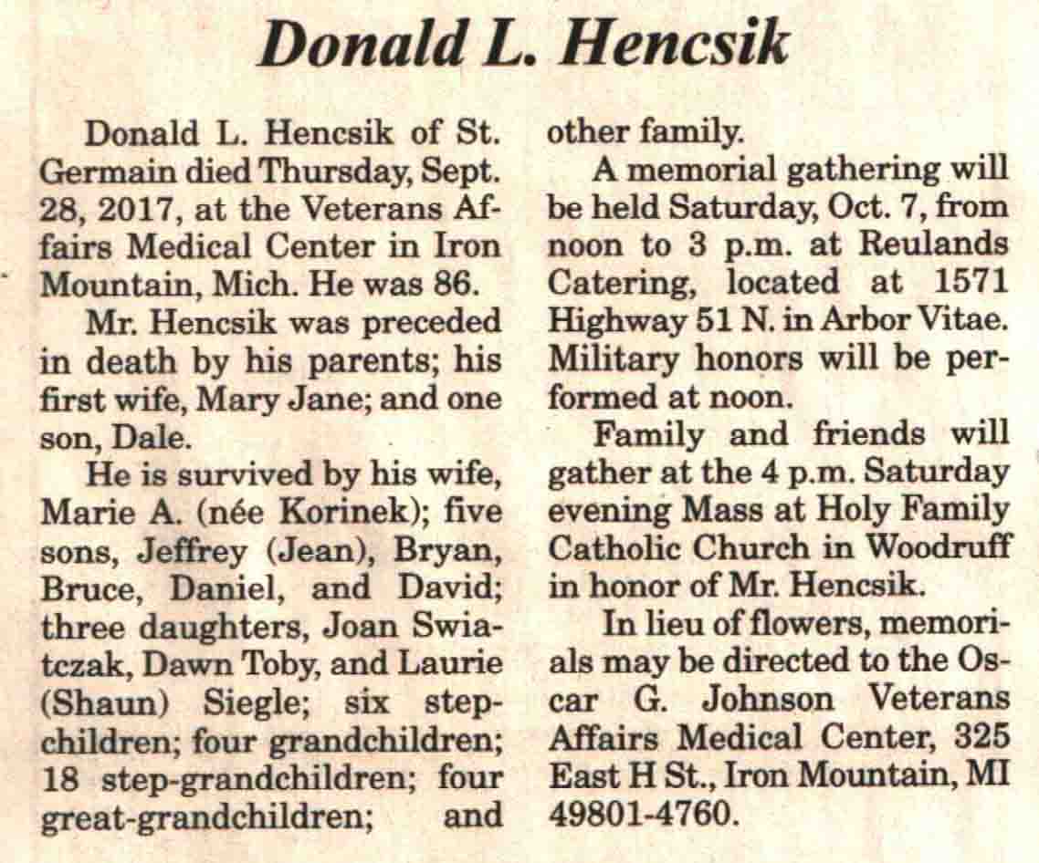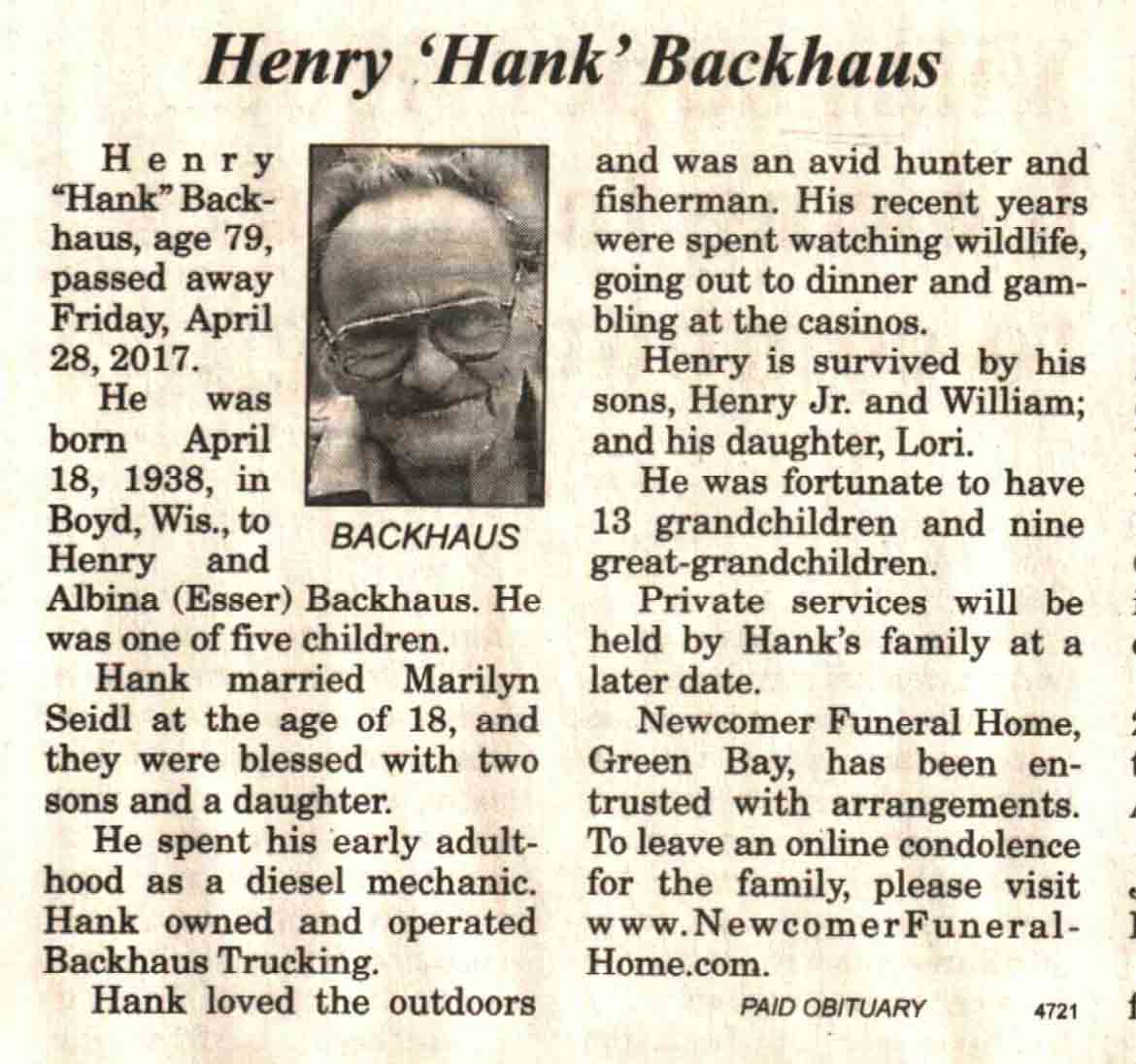 | Backhaus | Henry 'Hank' | 18 Apr 1938 | 28 Apr 2017 | V N-R | 03 May 2017 | 4 |