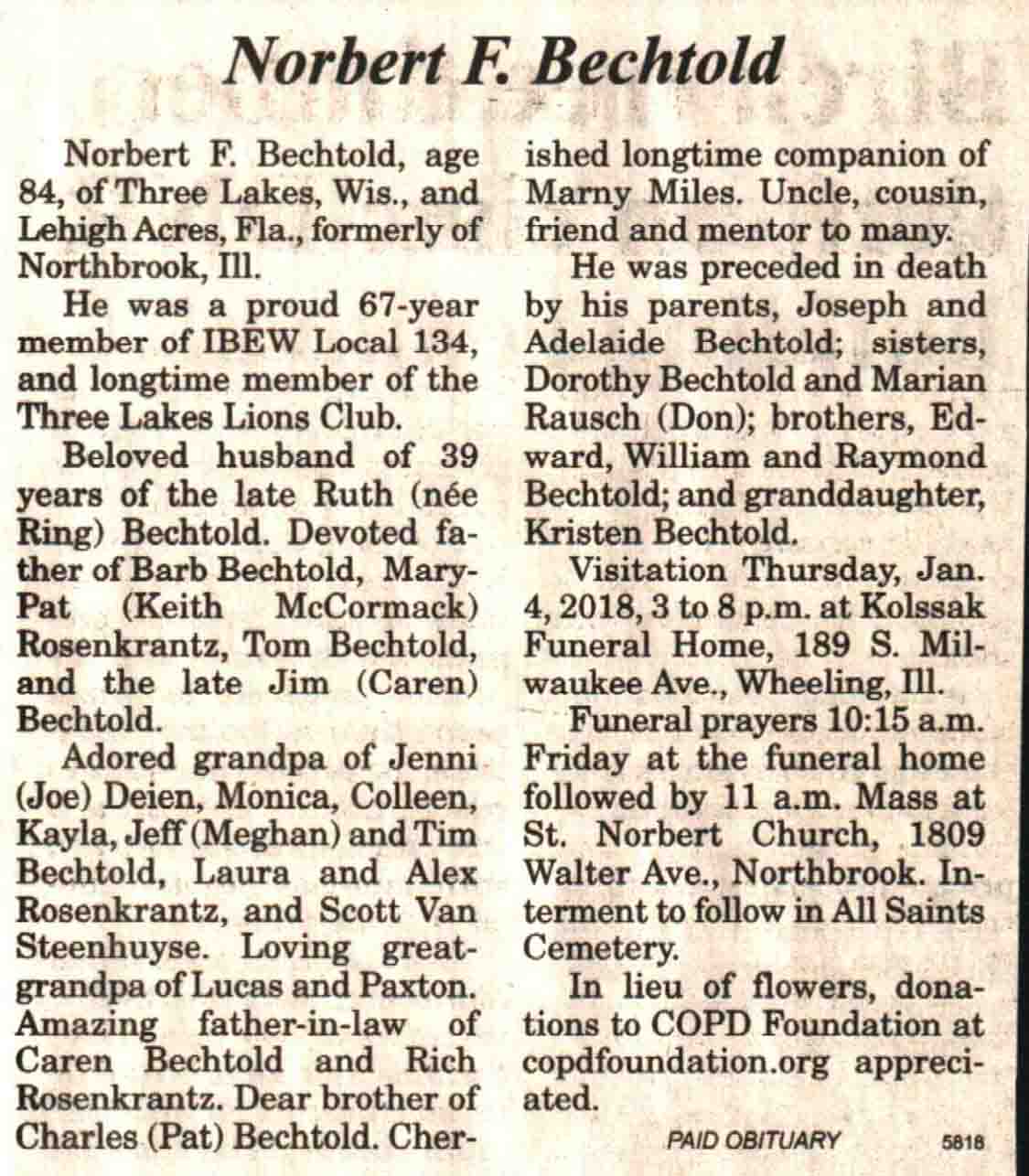 | Bechtold | Norbert F | c 1933 | c Dec 2017 | V N-R | 03 Jan 2018 | 4 |