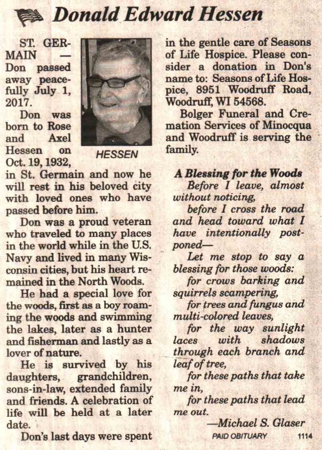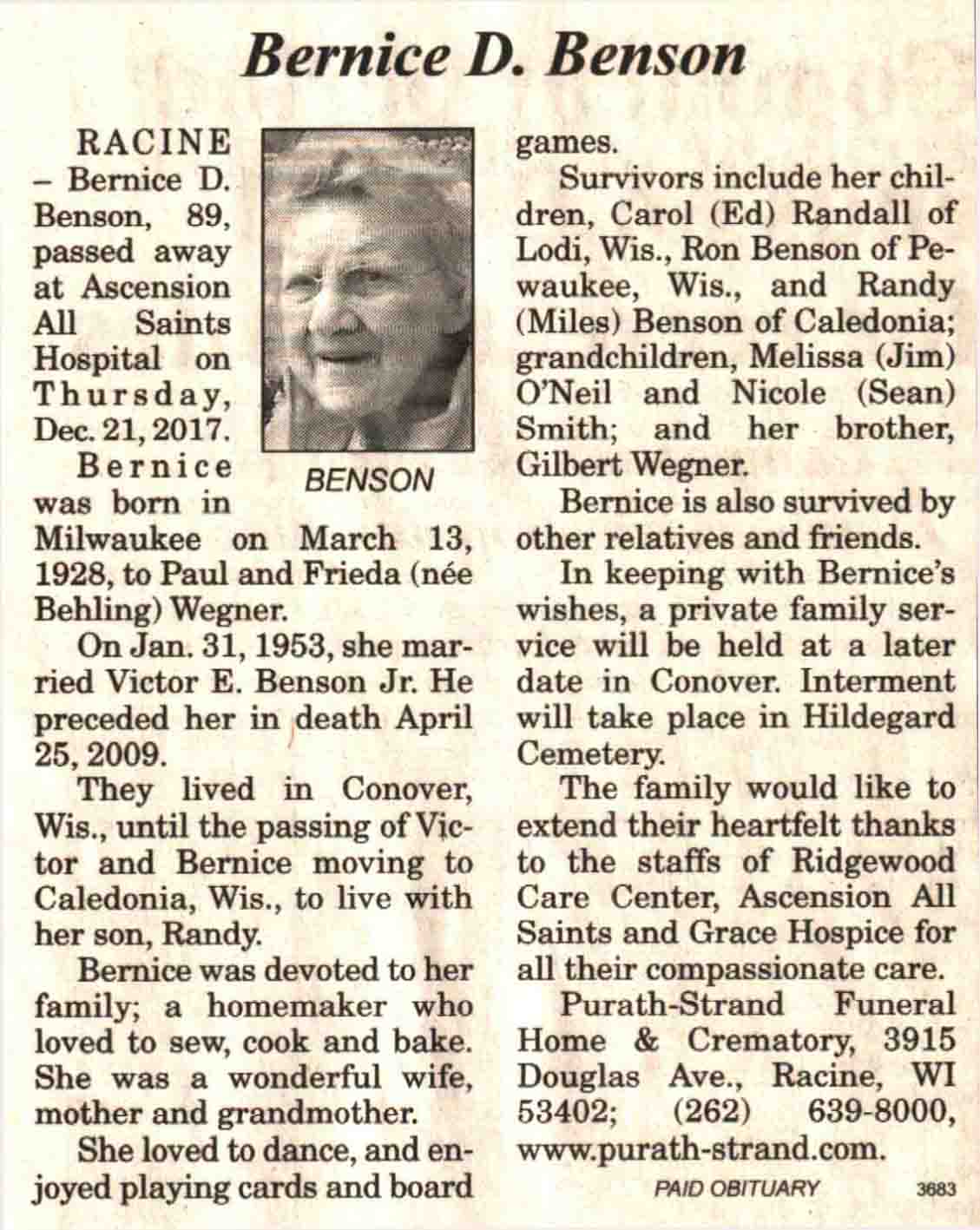 | Benson | Bernice D (Wegner) | 13 Mar 1928 | 21 Dec 2017 | V N-R | 27 Dec 2017 | 4A |