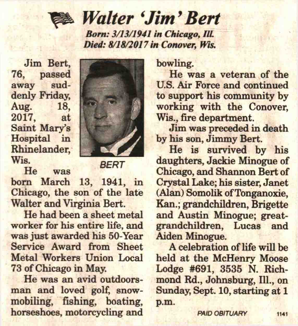 | Bert | Walter 'Jim' | 13 Mar 1941 | 18 Aug 2017 | V N-R | 30 Aug 2017 | 4A |