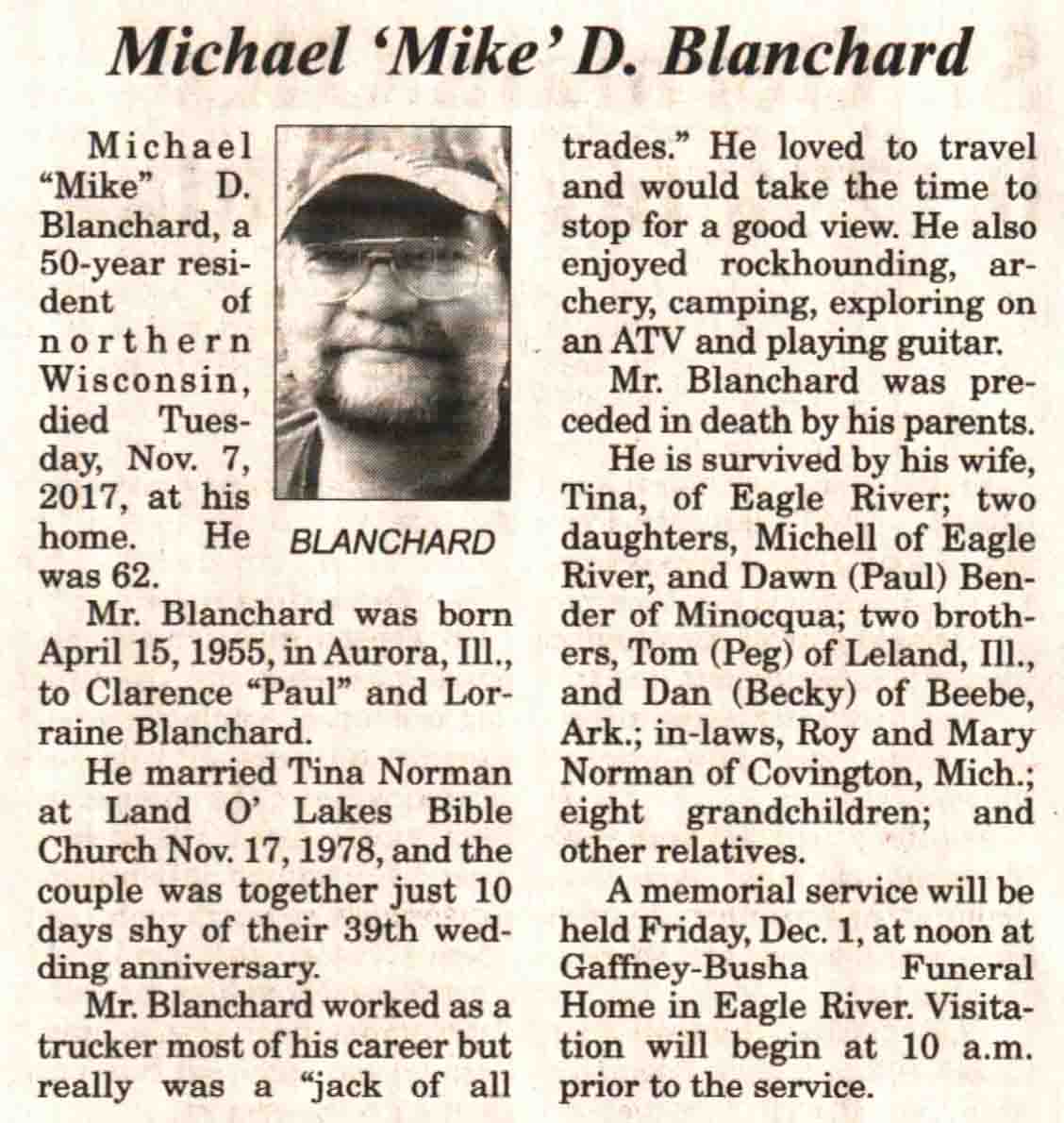 | Blanchard | Michael D 'Mike' | 15 Apr 1955 | 07 Nov 2017 | V N-R | 22 Nov 2017 | 4A |