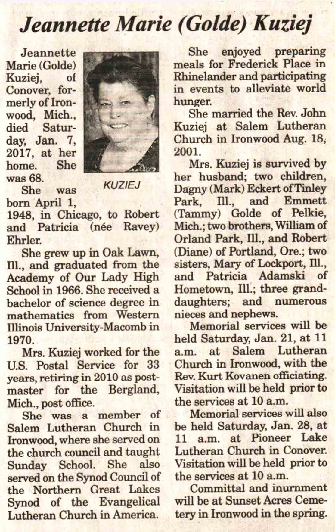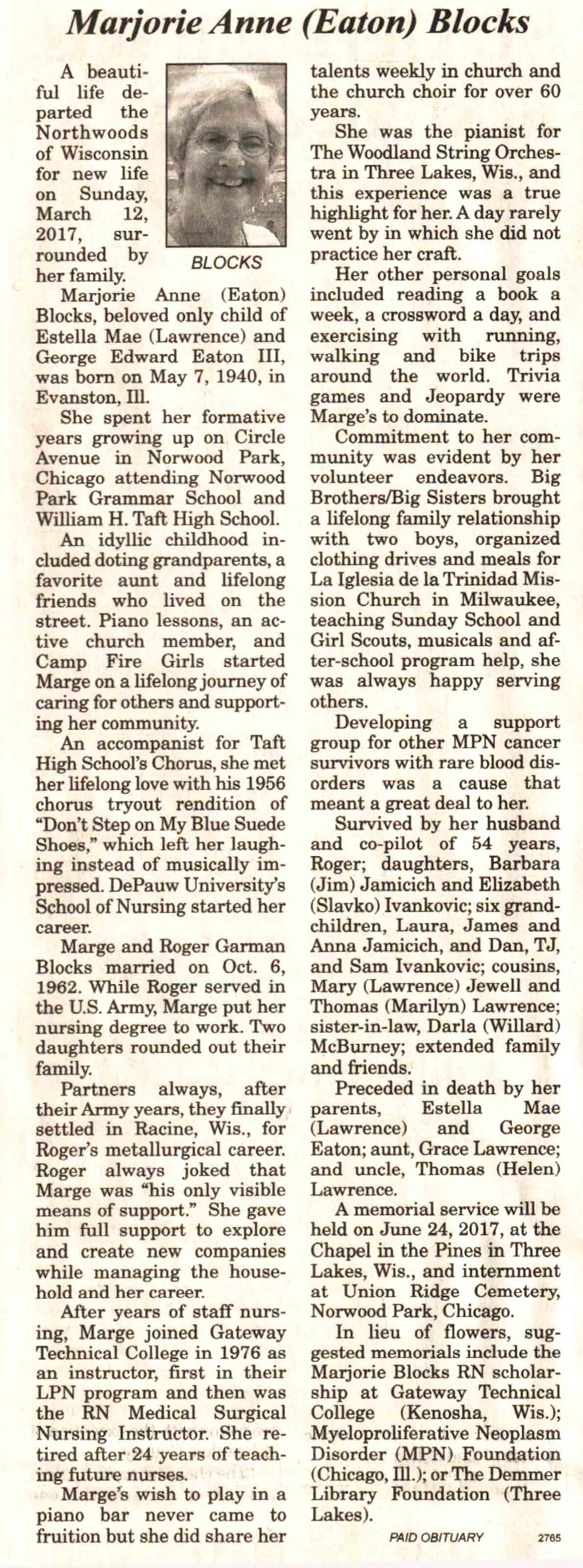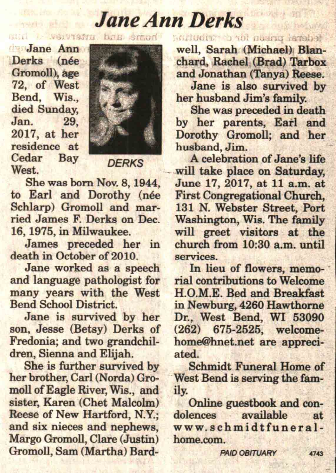 | Derks | Jane Ann (Gromoll) | 08 Nov 1944 | 29 Jan 2017 | V N-R | 15 Feb 2017 | 4 |