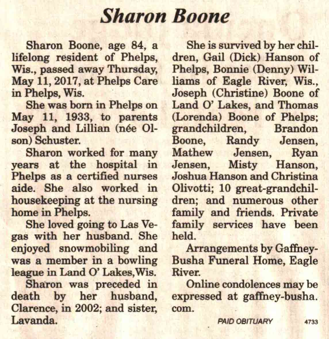 | Boone | Sharon (Schuster) | 11 May 1933 | 11 May 2017 | V N-R | 17 May 2017 | 4A |