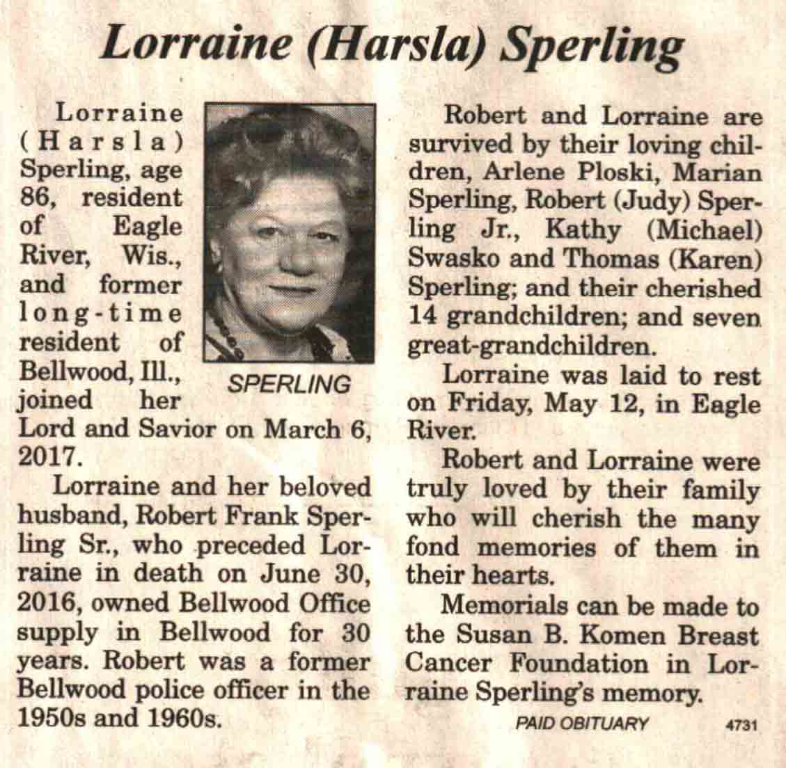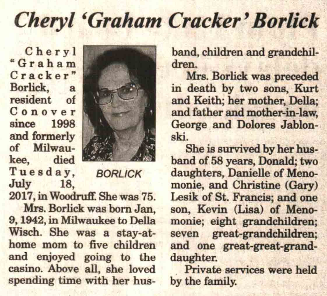 | Borlick | Cheryl 'Graham Cracker' (Wisch) | 09 Jan 1942 | 08 Jul 2017 | V N-R | 02 Aug 2017 | 4A |