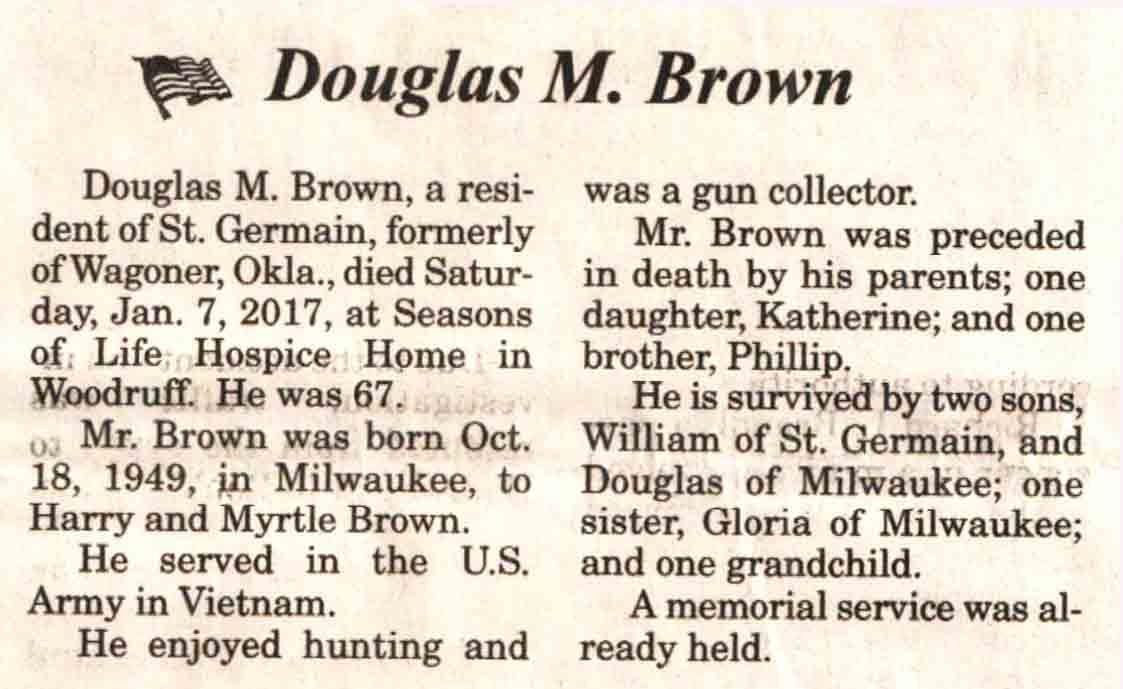 | Brown | Douglas M | 18 Oct 1949 | 07 Jan 2017 | V N-R | 25 Jan 2017 | 6A |