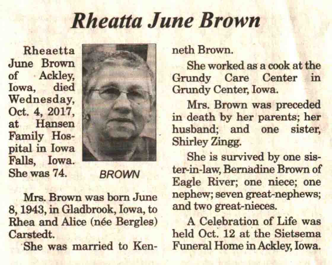| Brown | Rheatta June (Carstedt) | 08 Jun 1943 | 04 Oct 2017 | V N-R | 25 Oct 2017 | 4 |