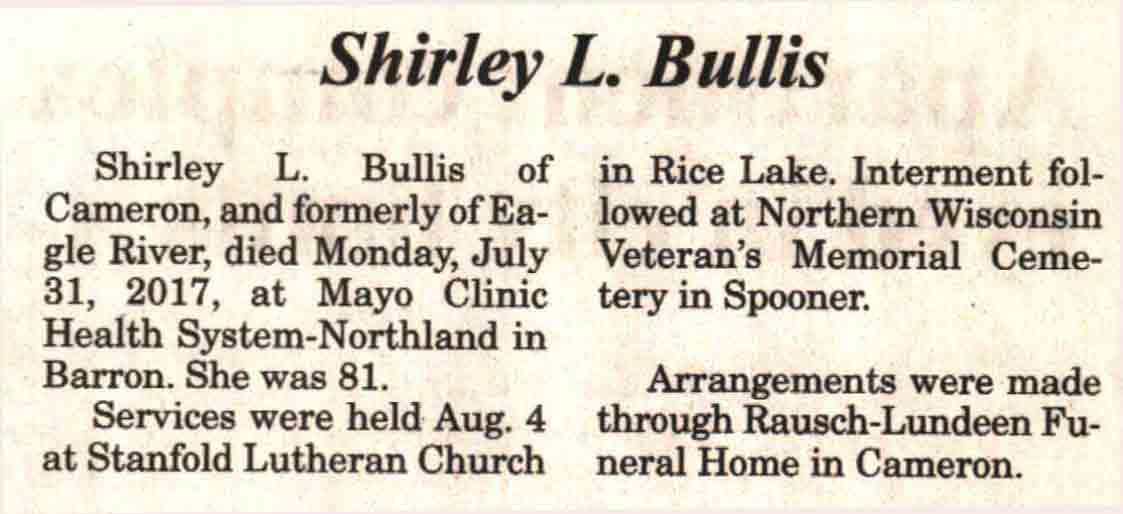 | Bullis | Shirley L | c 1936 | 31 Jul 2017 | V N-R | 09 Aug 2017 | 4A |
