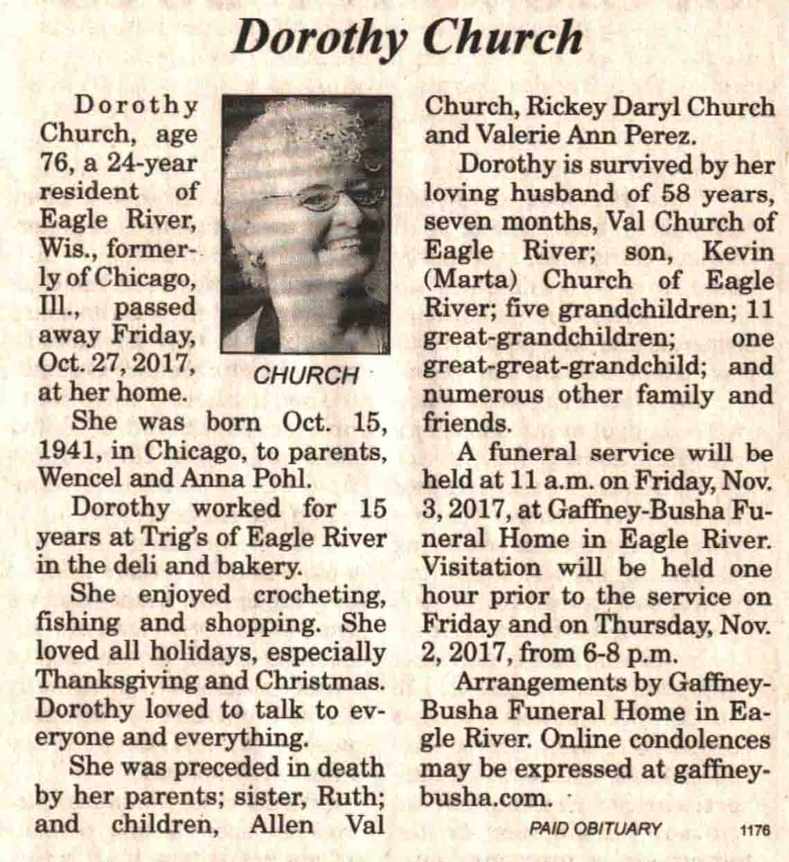 | Church | Dorothy (Pohl) | 15 Oct 1941 | 27 Oct 2017 | V N-R | 01 Nov 2017 | 4A |