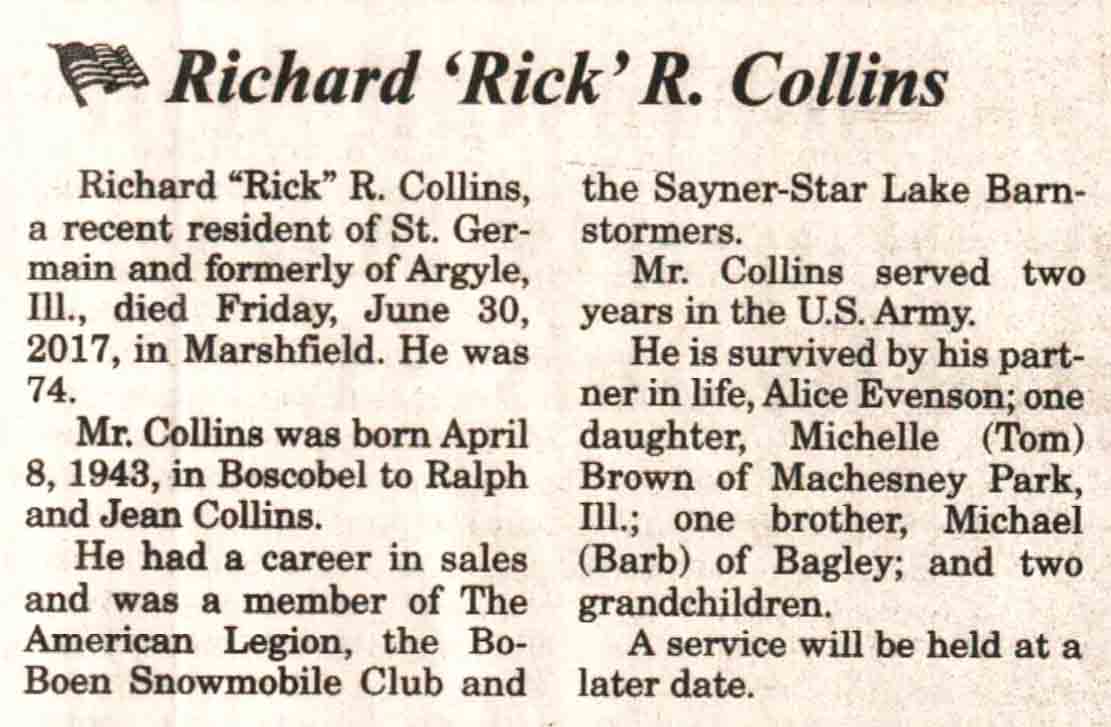 | Collins | Richard R 'Rick' | 08 Apr 1943 | 30 Jun 2017 | V N-R | 12 Jul 2017 | 4A |