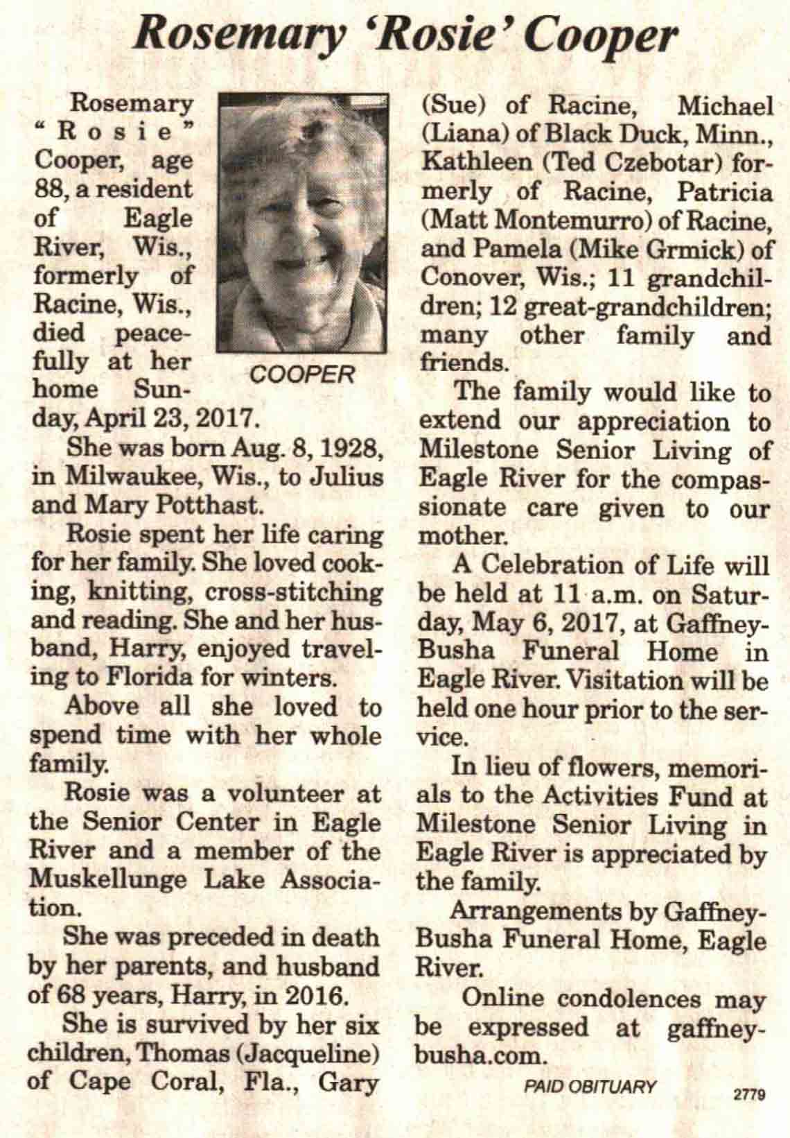 | Cooper | Rosemary 'Rosie' (Potthast) | 28 Aug 1928 | 23 Apr 2017 | V N-R | 26 Apr 2017 | 4A |