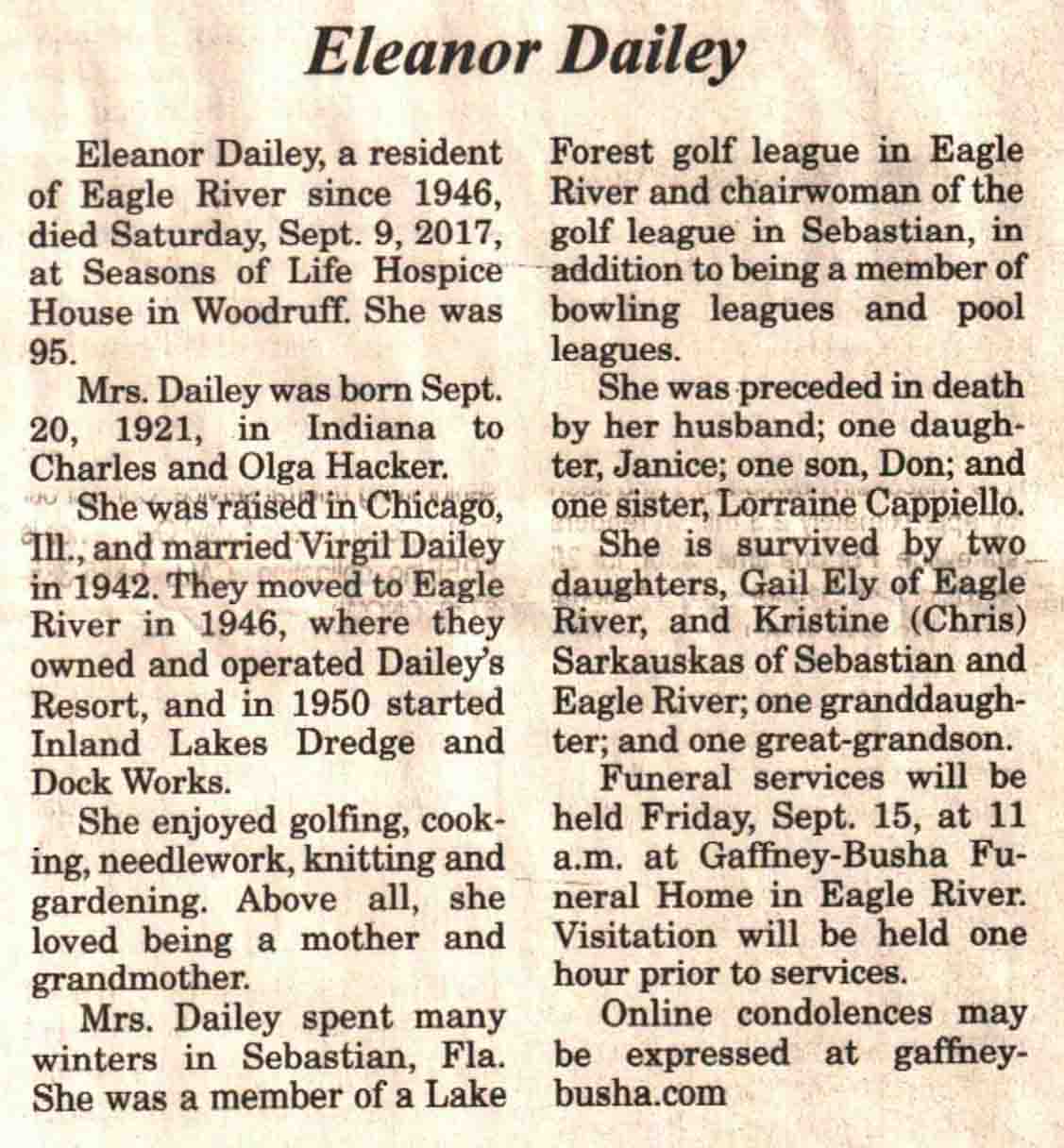 | Dailey | Eleanor (Hacker) | 20 Sep 1921 | 09 Sep 2017 | V N-R | 13 Sep 2017 | 4A |