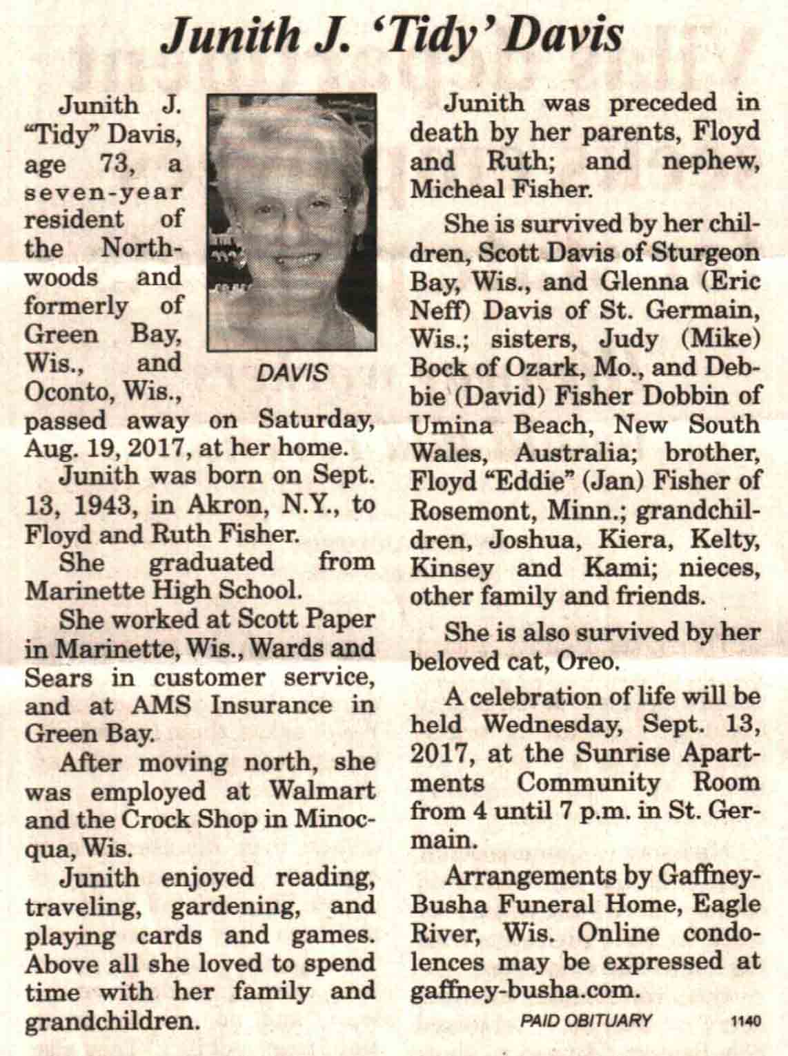 | Davis | Junith J 'Tidy' (Fisher) | 13 Sep 1943 | 19 Aug 2017 | V N-R | 23 Aug 2017 | 4A |