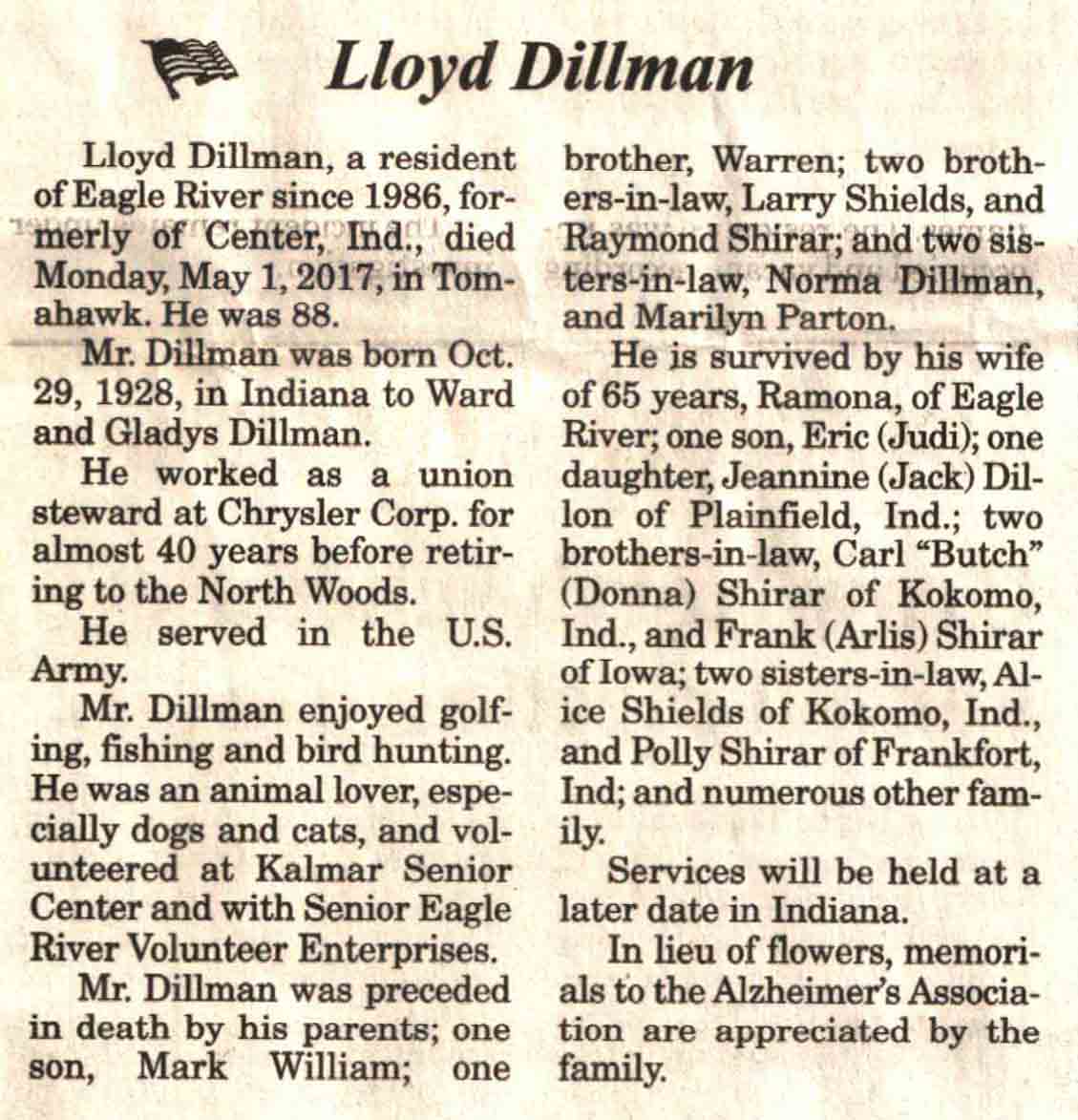 | Dillman | Lloyd | 29 Oct 1928 | 01 May 2017 | V N-R | 03 May 2017 | 4 |
