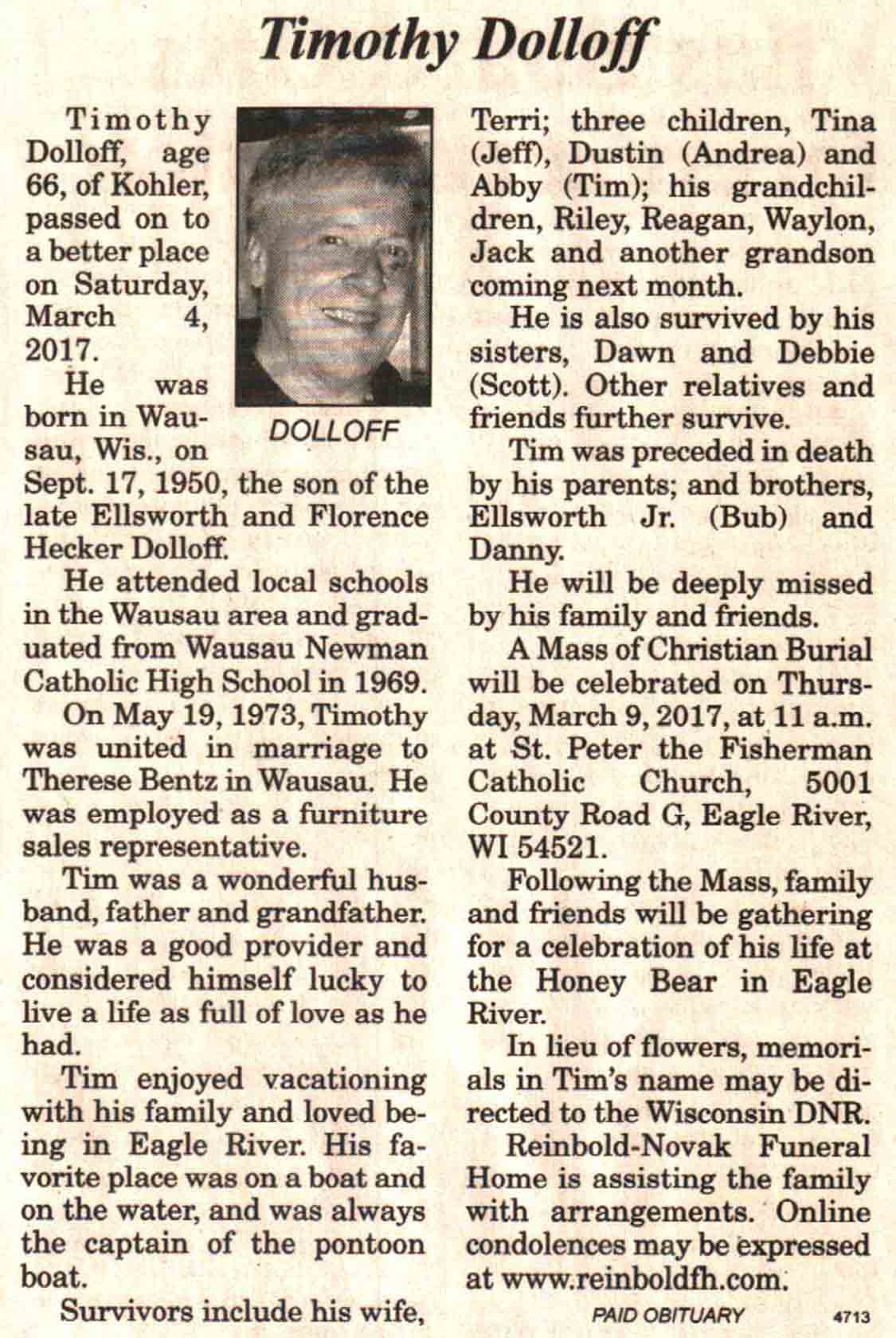| Dolloff | Timothy | 17 Sep 1950 | 04 Mar 2017 | V N-R | 08 Mar 2017 | 4A |