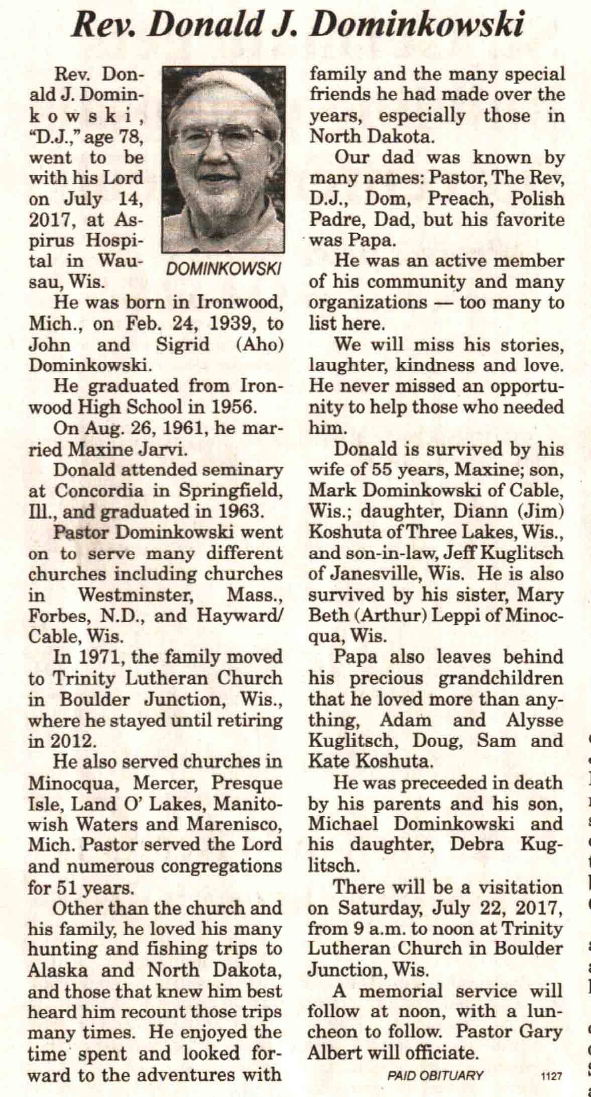| Dominkowski | Donald J, Rev | 24 Feb 1939 | 14 Jul 2017 | V N-R | 19 Jul 2017 | 4A |