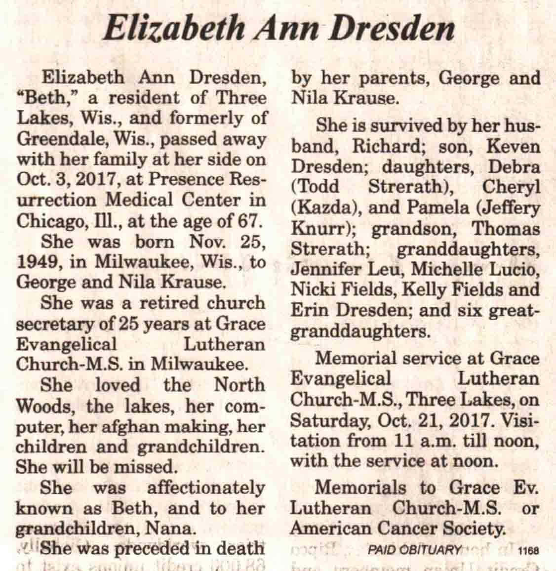 | Dresden | Elizabeth Ann (Krause) | 25 Nov 1949 | 03 Oct 2017 | V N-R | 18 Oct 2017 | 4A |