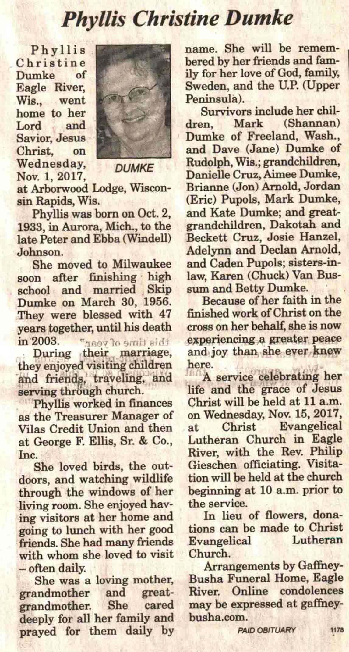 | Dumke | Phyllis Christine (Johnson) | 02 Oct 1933 | 01 Nov 2017 | V N-R | 08 Nov 2017 | 4 |