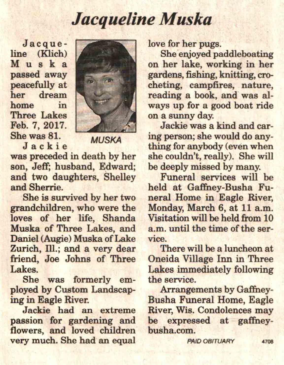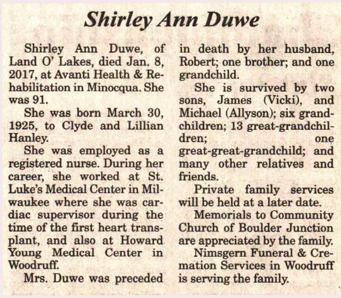 | Duwe | Shirley Ann (Hanley) | 30 Mar 1925 | 08 Jan 2017 | V N-R | 18 Jan 2017 | 5A |