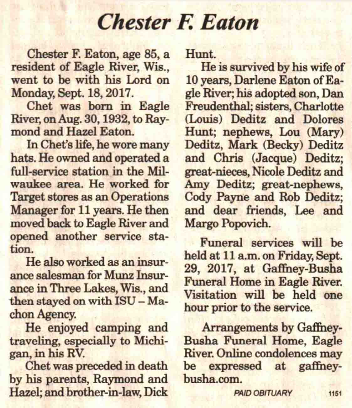 | Eaton | Chester F | 30 Aug 1932 | 18 Sep 2017 | V N-R | 27 Sep 2017 | 4A |