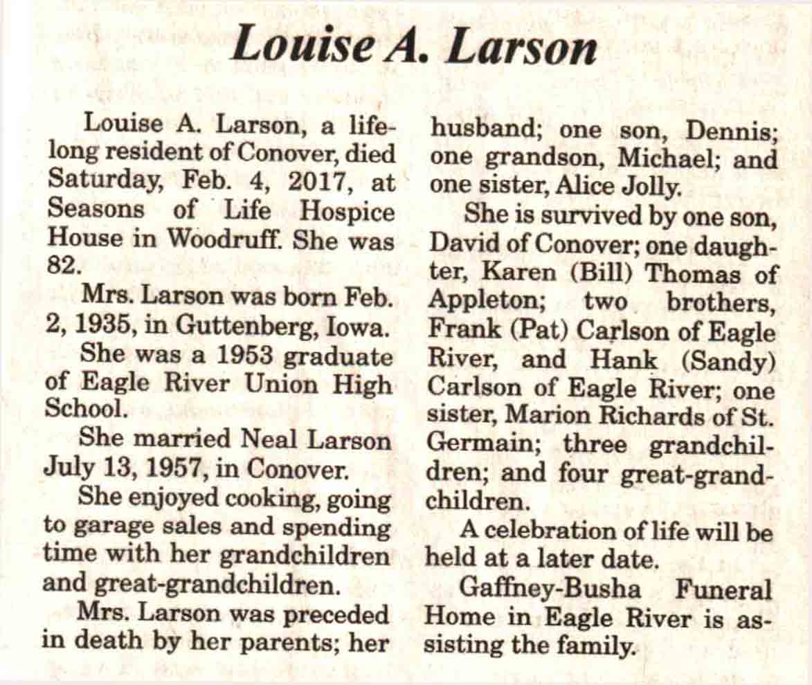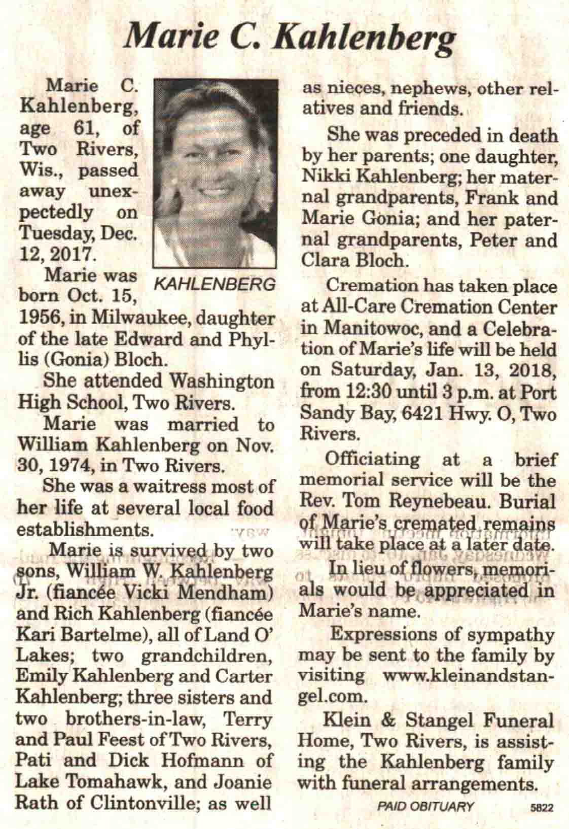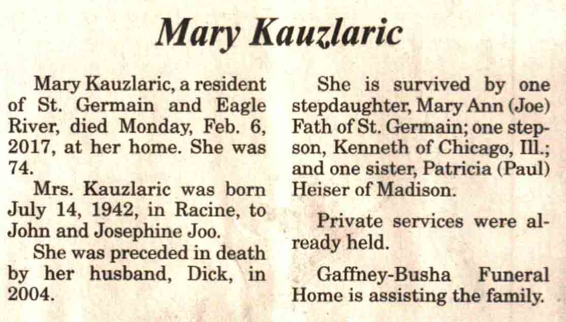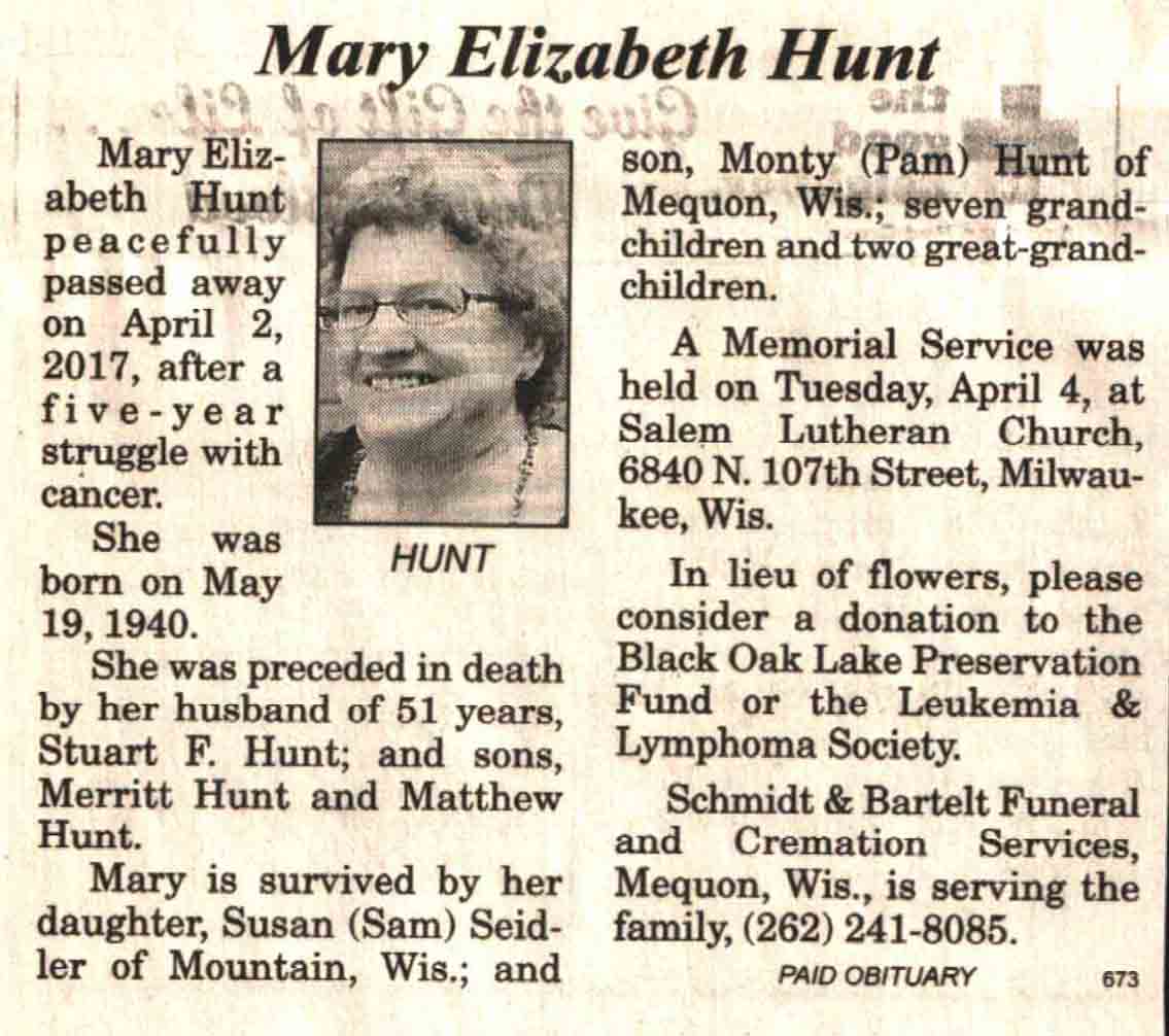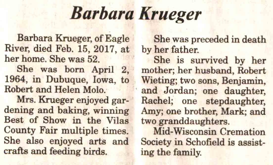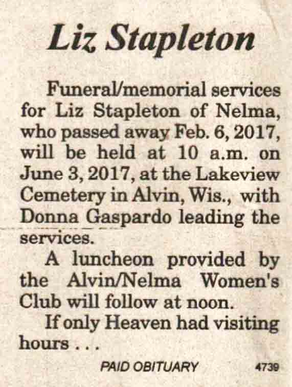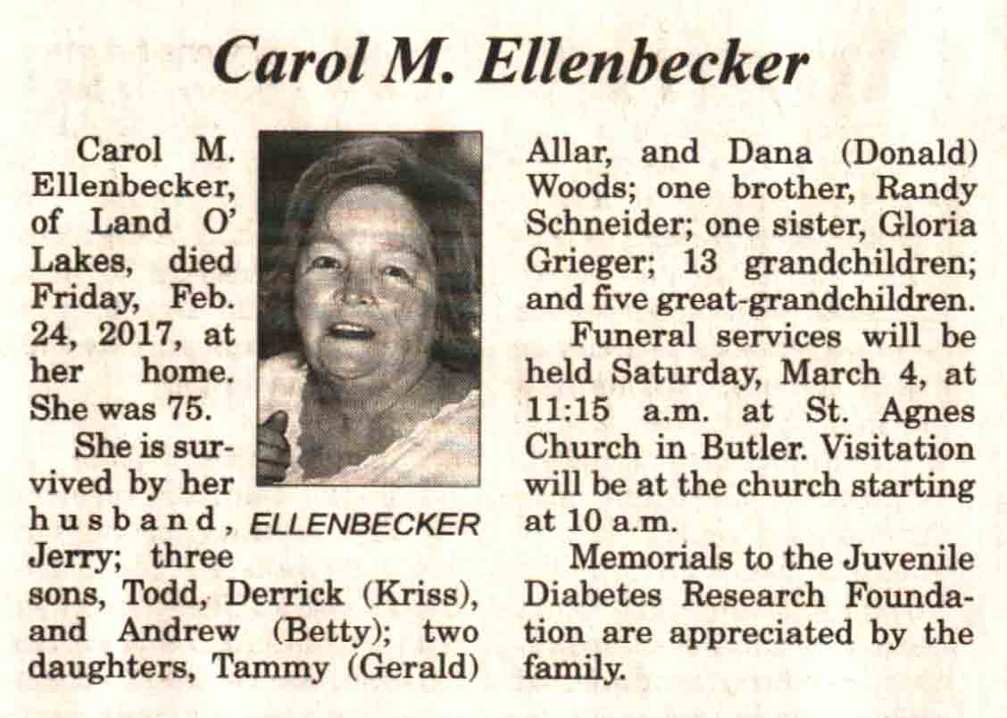 | Ellenbecker | Carol M | c 1942 | 14 Feb 2017 | V N-R | 01 Mar 2017 | 4 |