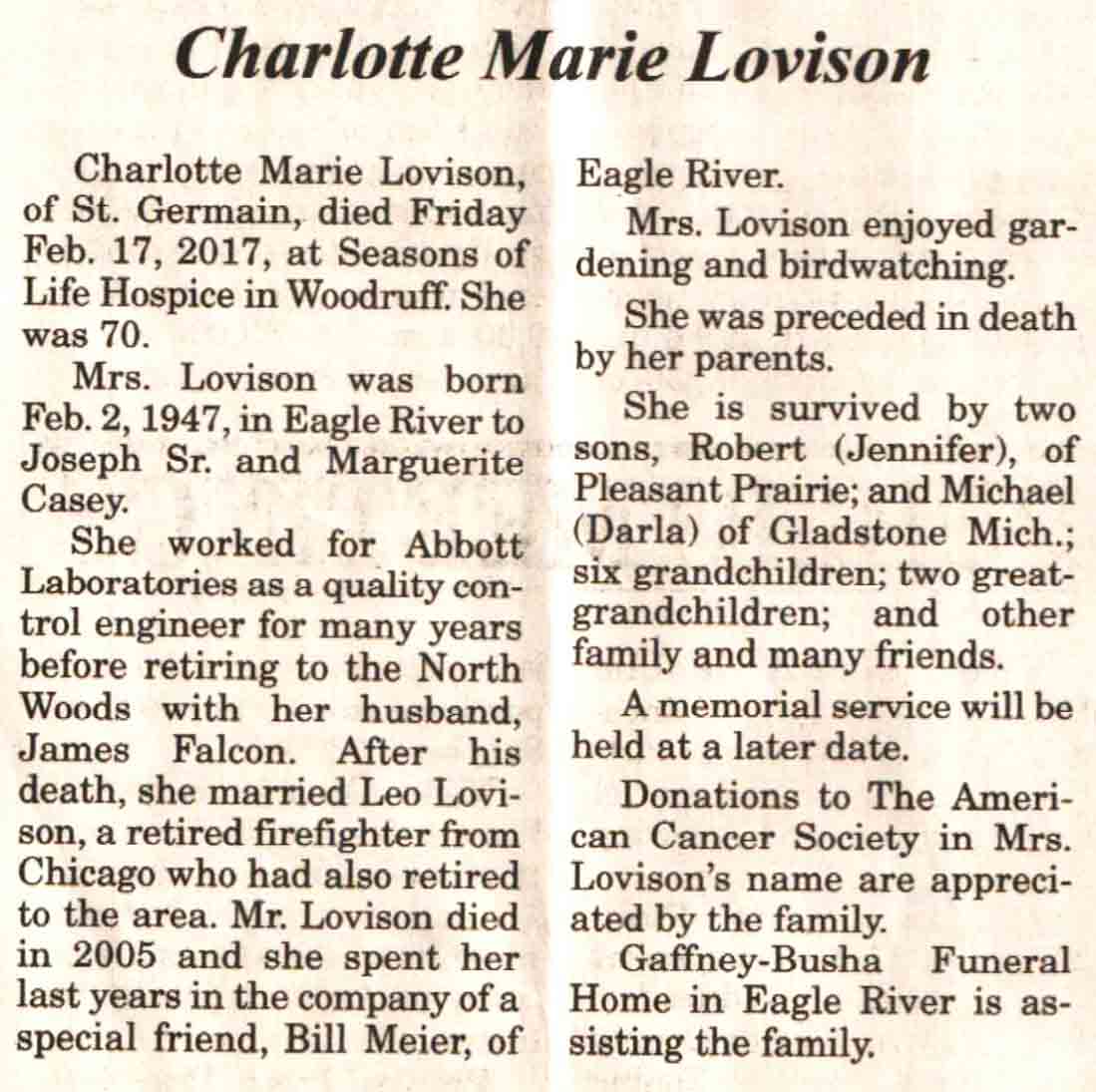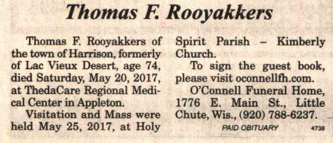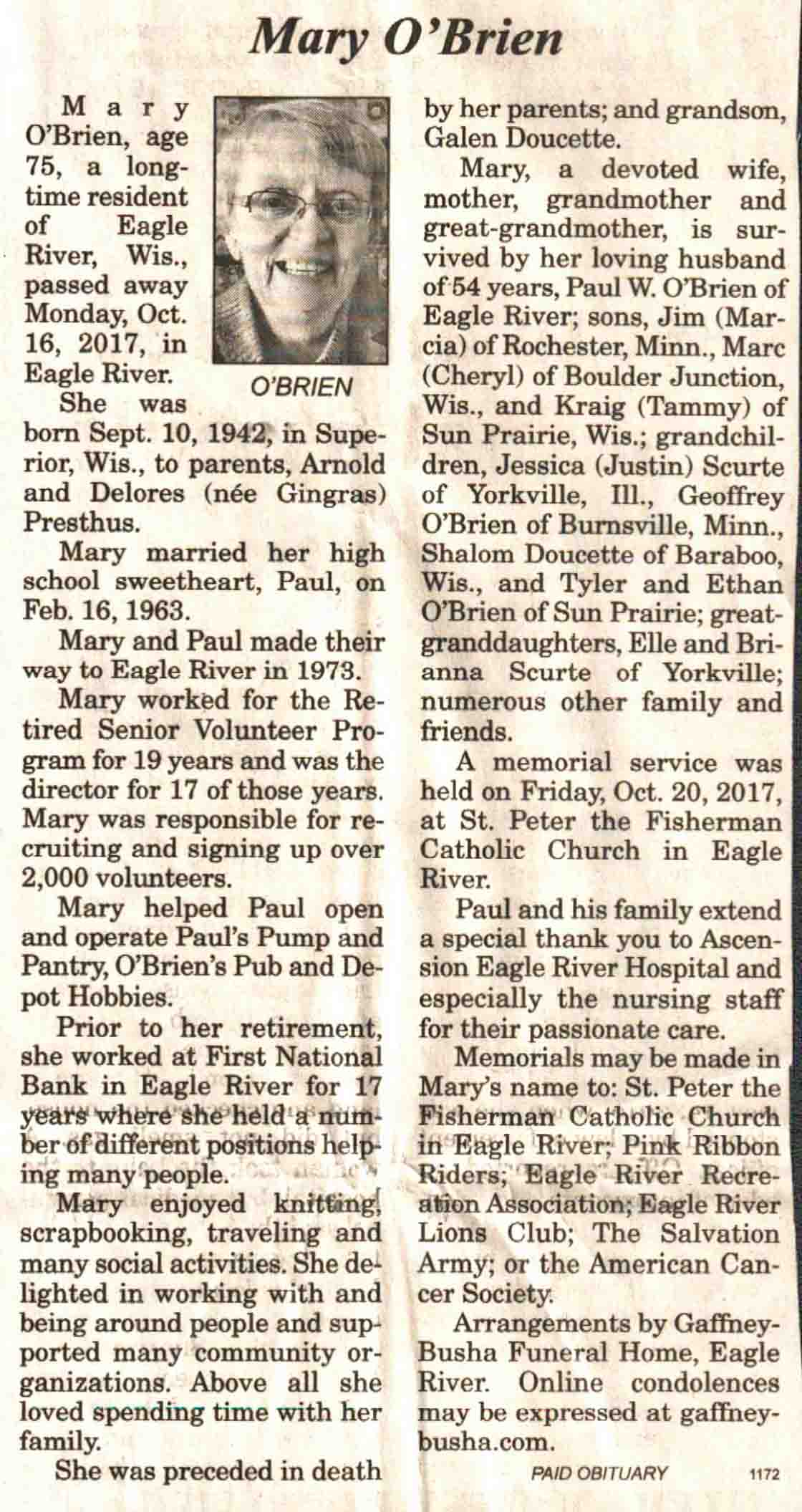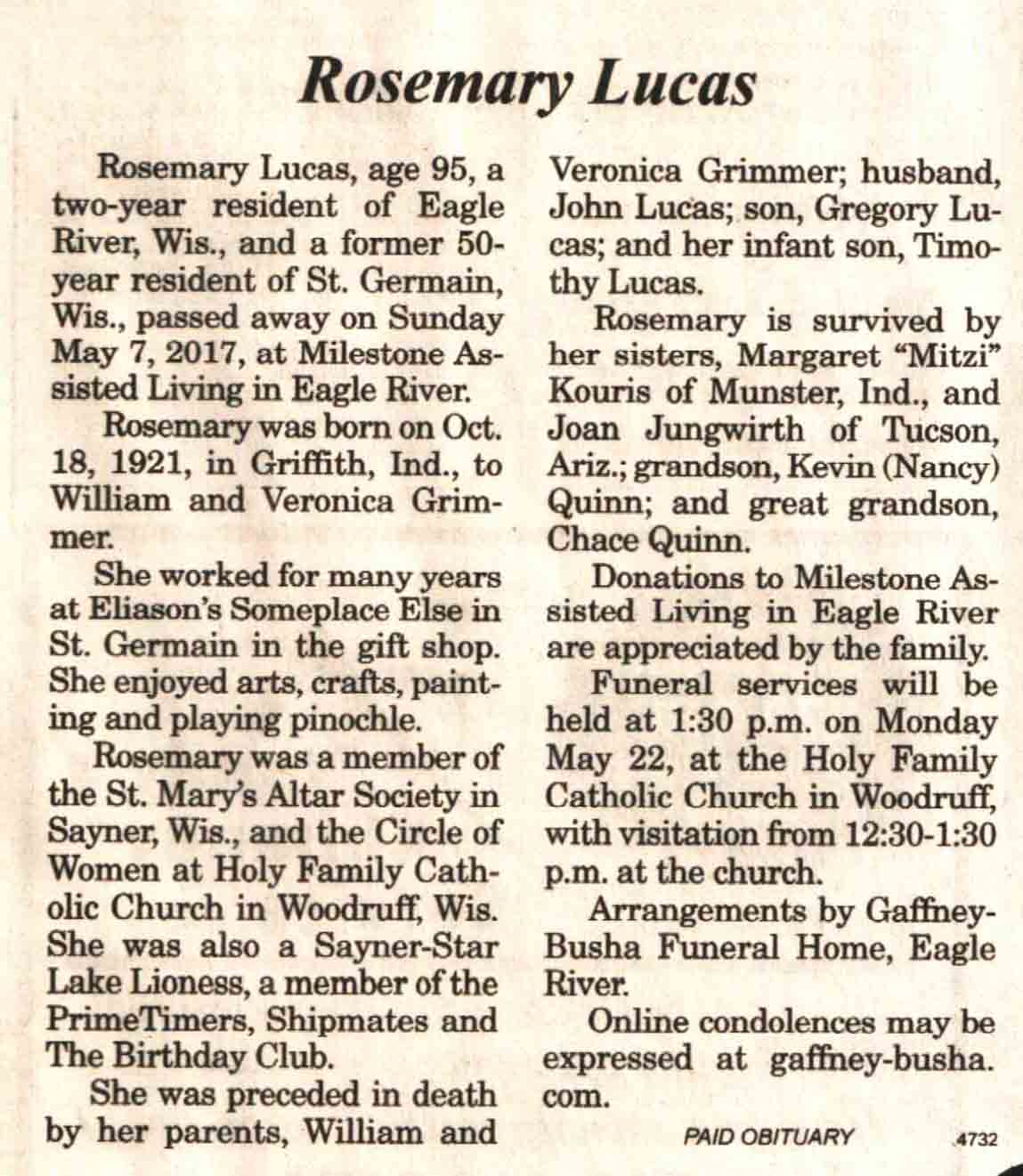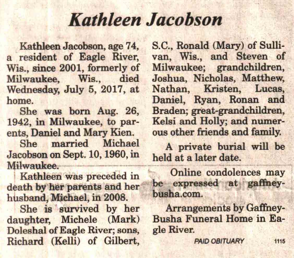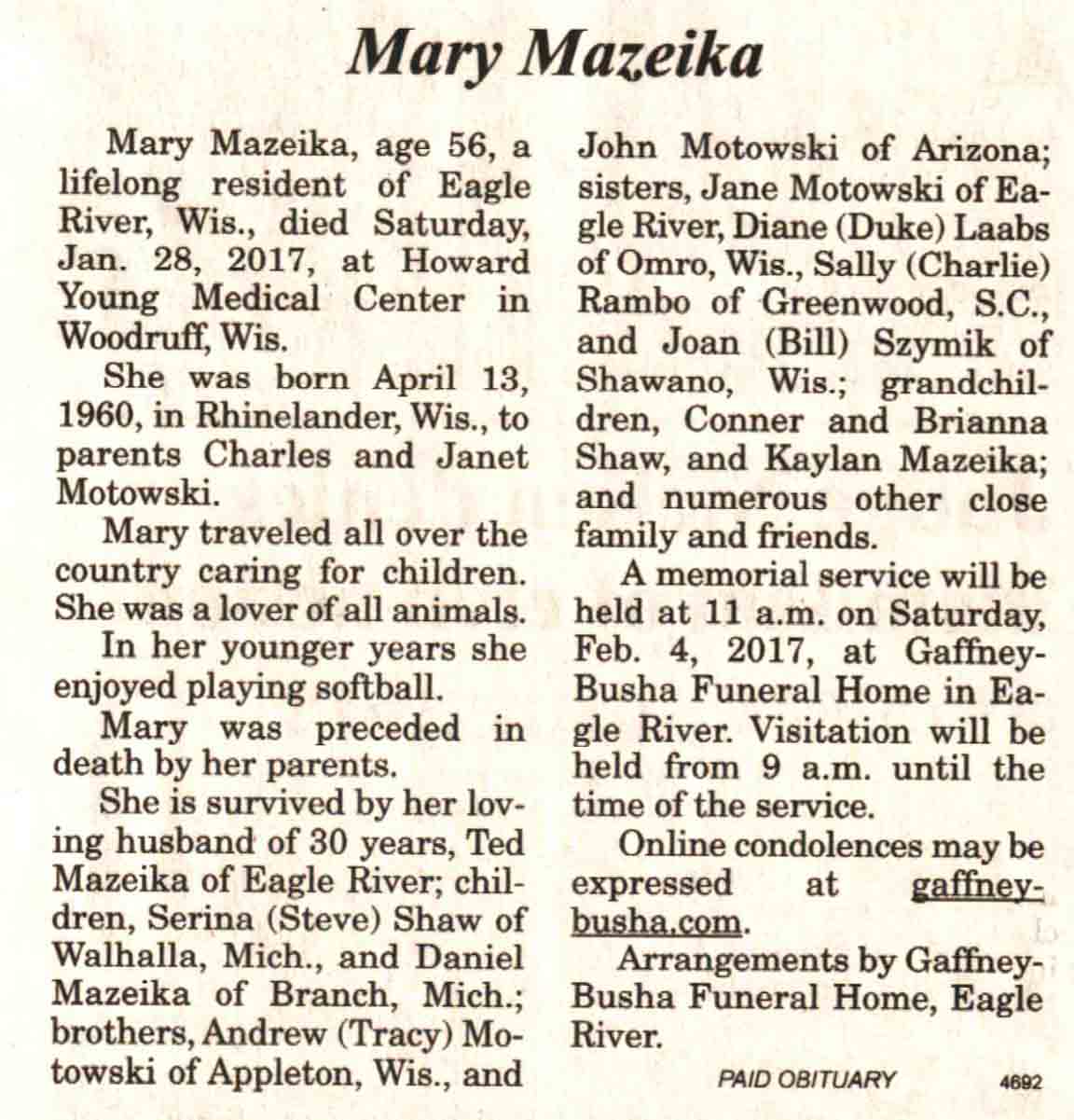| Ellenbecker | Carol M | c 1942 | 14 Feb 2017 | V N-R | 01 Mar 2017 | 4 |