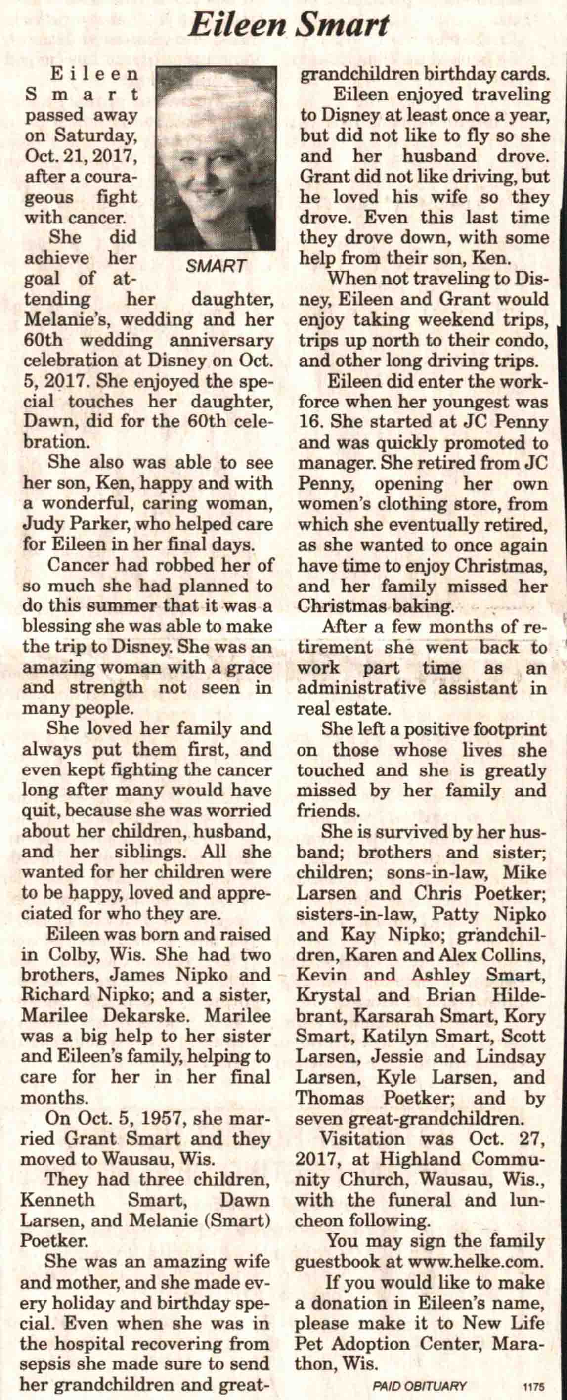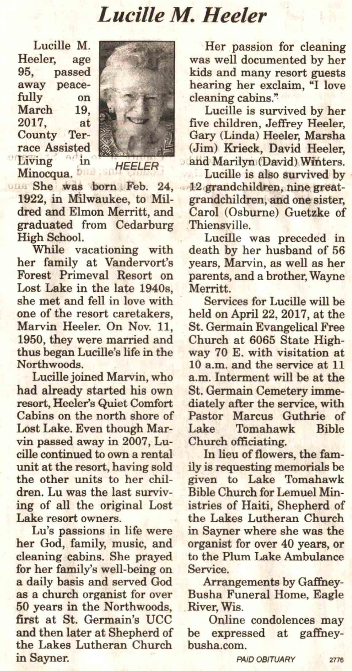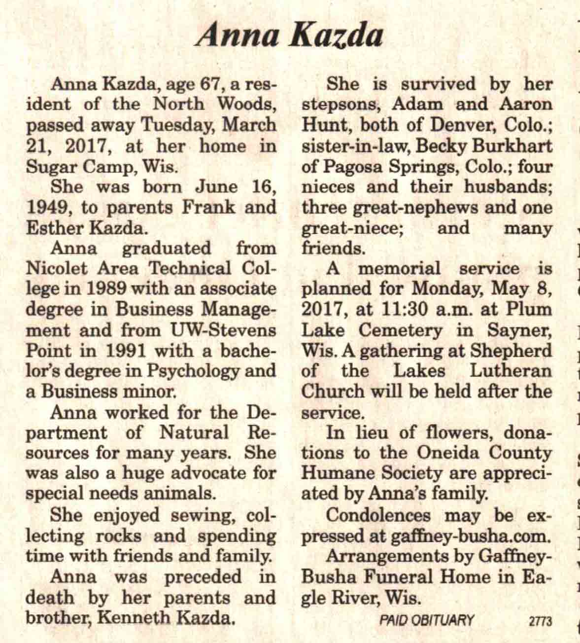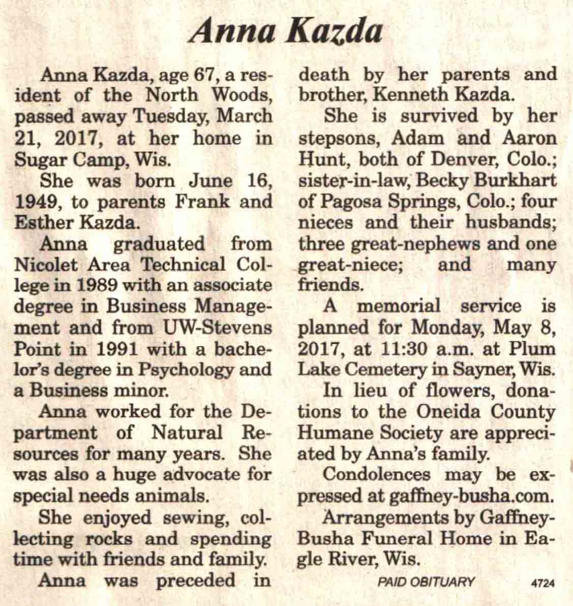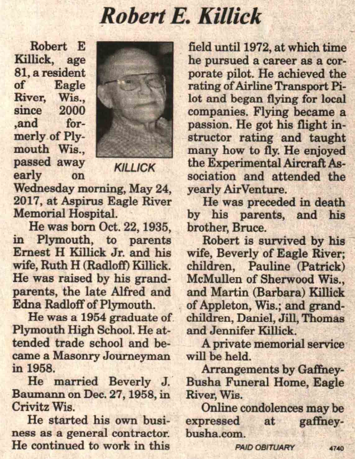 | Ellenbecker | Carol M | c 1942 | 14 Feb 2017 | V N-R | 01 Mar 2017 | 4 |