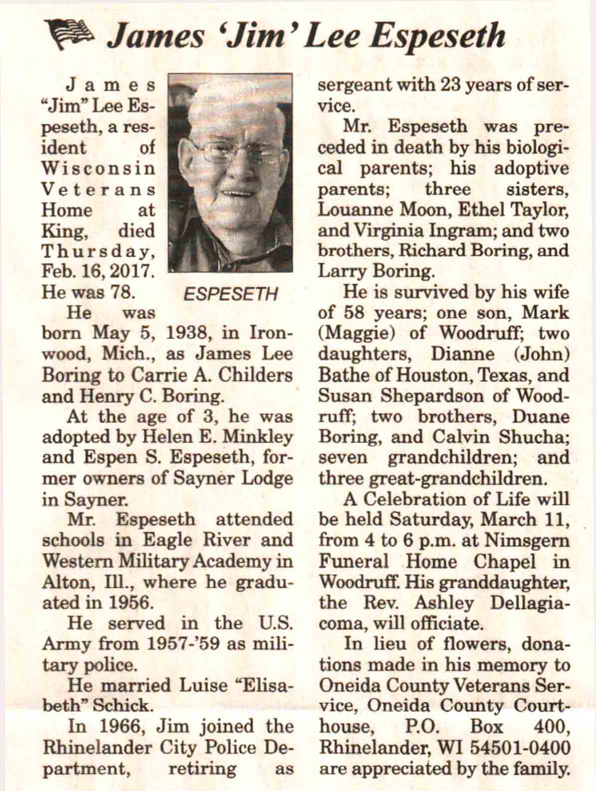 | Espeseth | James Lee 'Jim' | 05 May 1938 | 16 Feb 2017 | V N-R | 22 Feb 2017 | 4A |
