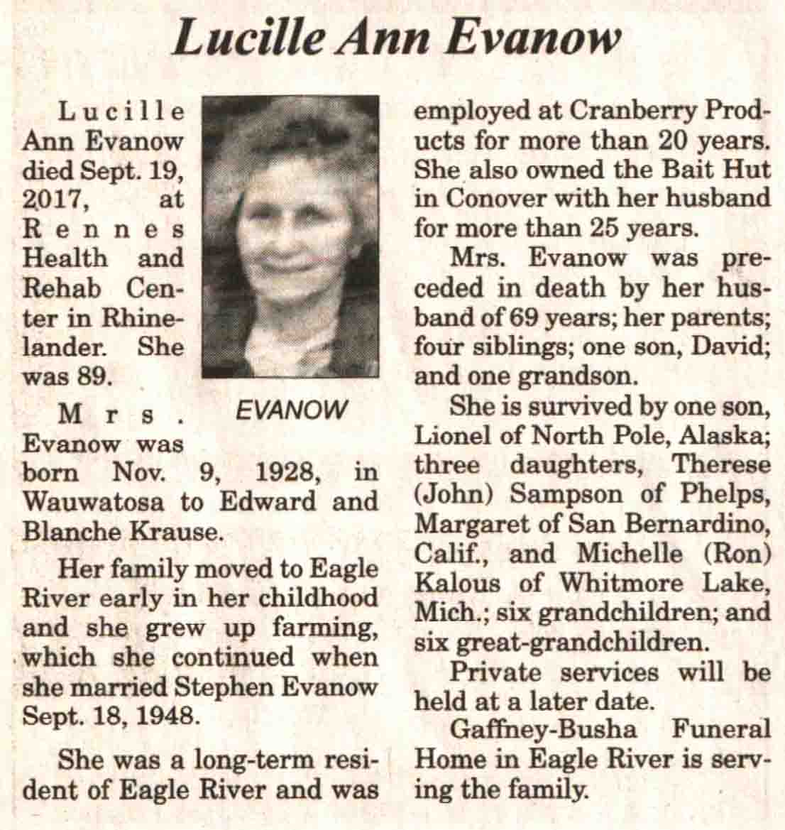 | Evanow | Lucille Ann (Krause) | 09 Nov 1928 | 19 Sep 2017 | V N-R | 08 Nov 2017 | 4 |