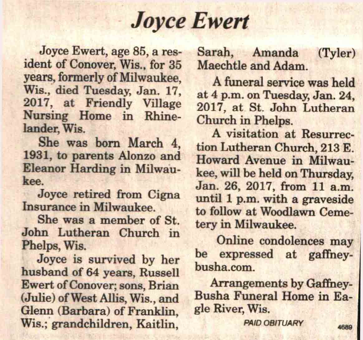| Ewert | Joyce (Harding) | 04 Mar 1931 | 17 Jan 2017 | V N-R | 25 Jan 2017 | 6A |