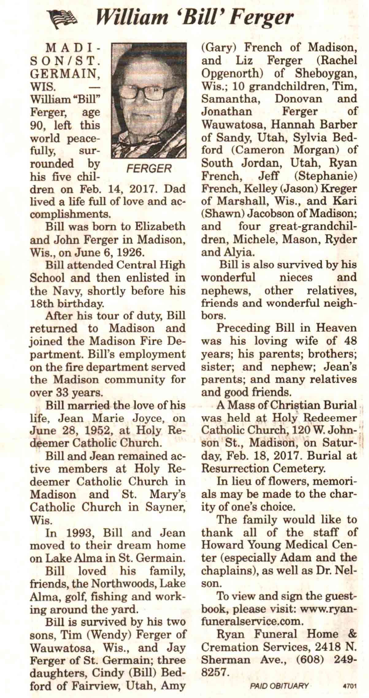 | Ferger | William 'Bill' | 06 Jun 1926 | 14 Feb 2017 | V N-R | 22 Feb 2017 | 4A |
