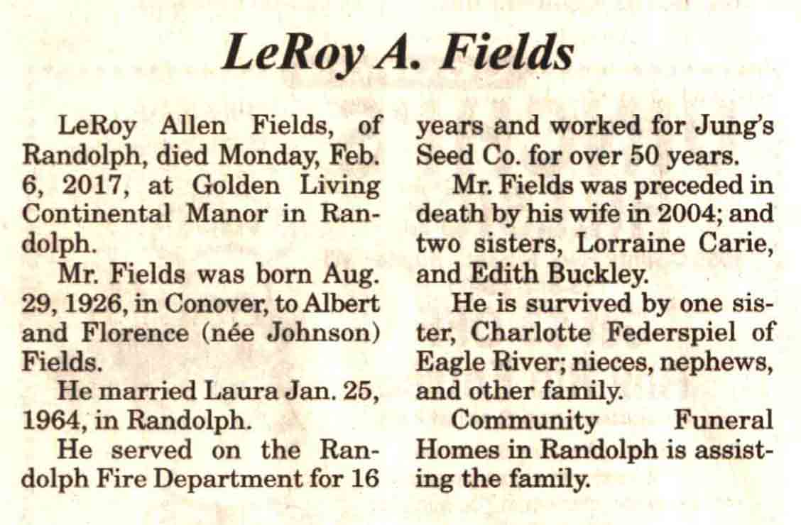 | Fields | LeRoy A | 29 Aug 1926 | 06 Feb 2017 | V N-R | 15 Feb 2017 | 4 |