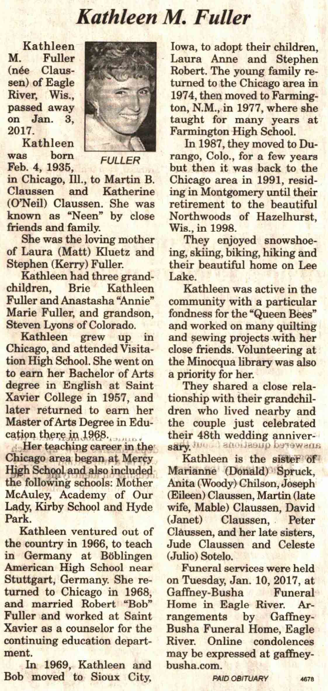 | Fuller | Kathleen M (Claussen) | 04 Feb 1935 | 03 Jan 2017 | V N-R | 11 Jan 2017 | 4 |