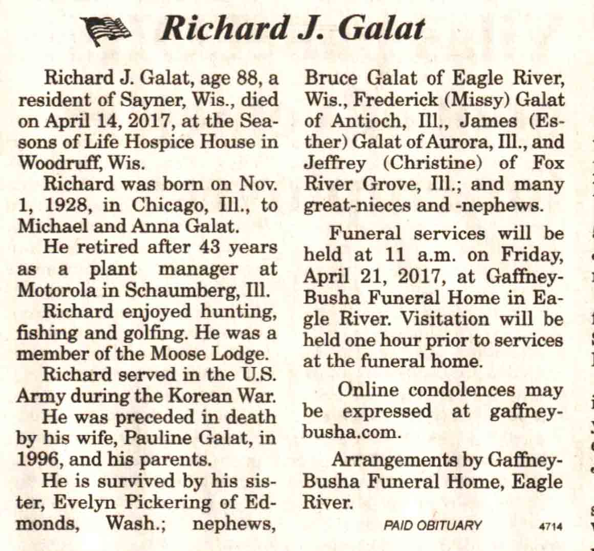 | Galat | Richard J | 01 Nov 1928 | 14 Apr 2017 | V N-R | 19 Apr 2017 | 4 |