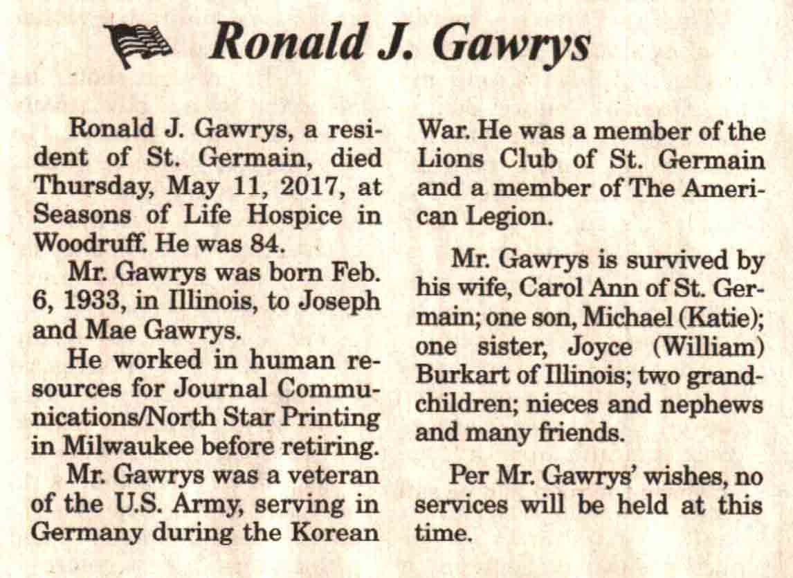 | Gawrys | Ronald J | 06 Feb 1933 | 11 May 2017 | V N-R | 17 May 2017 | 4A |