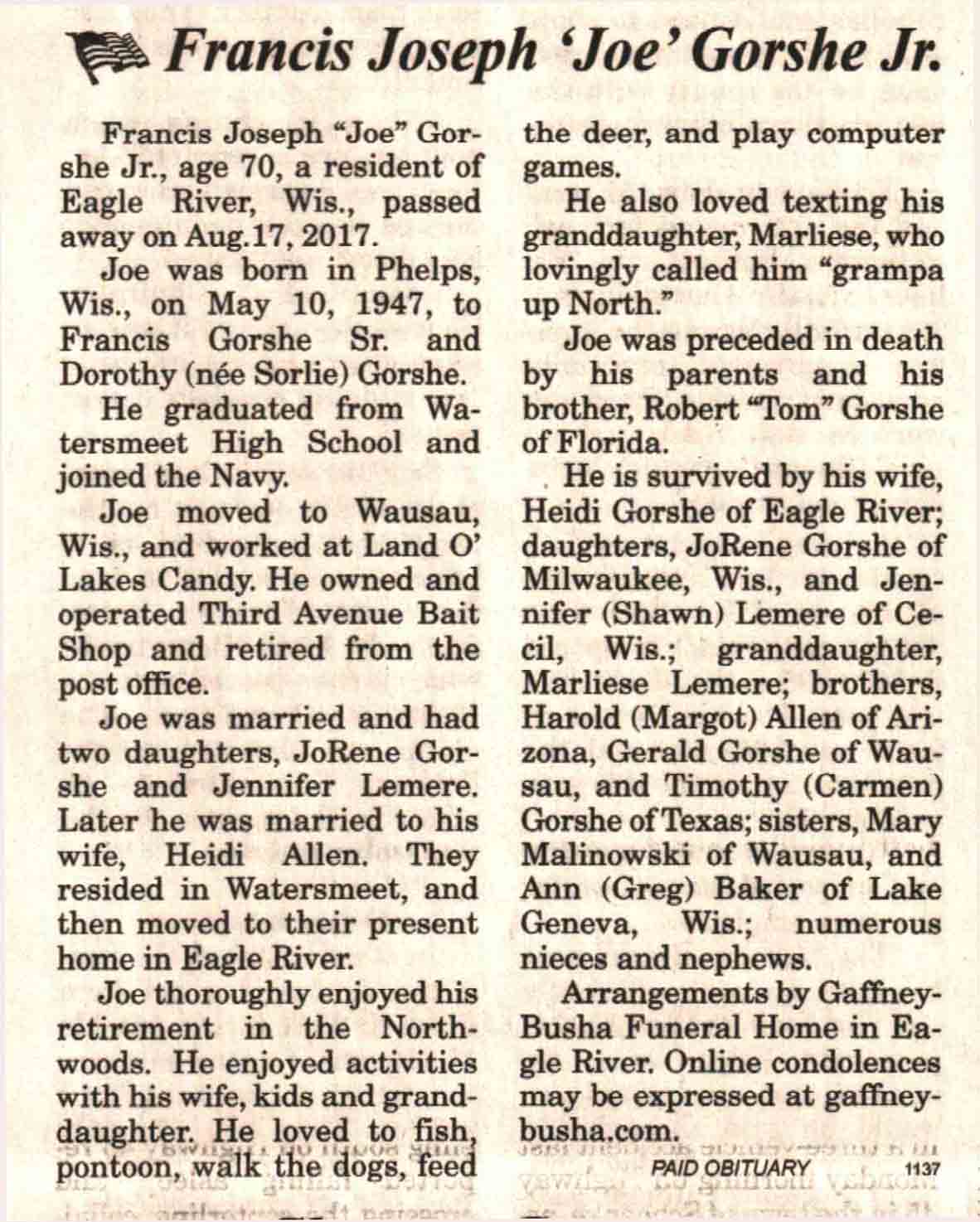 | Gorshe | Francis Joseph, Jr 'Joe' | 10 May 1947 | 17 Aug 2017 | V N-R | 23 Aug 2017 | 4A |