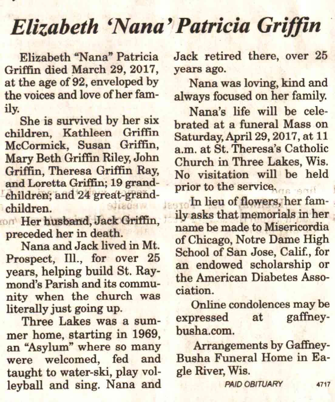 | Griffin | Elizabeth Patricia 'Nana' | c 1925 | 29 Mar 2017 | V N-R | 26 Apr 2017 | 4A |