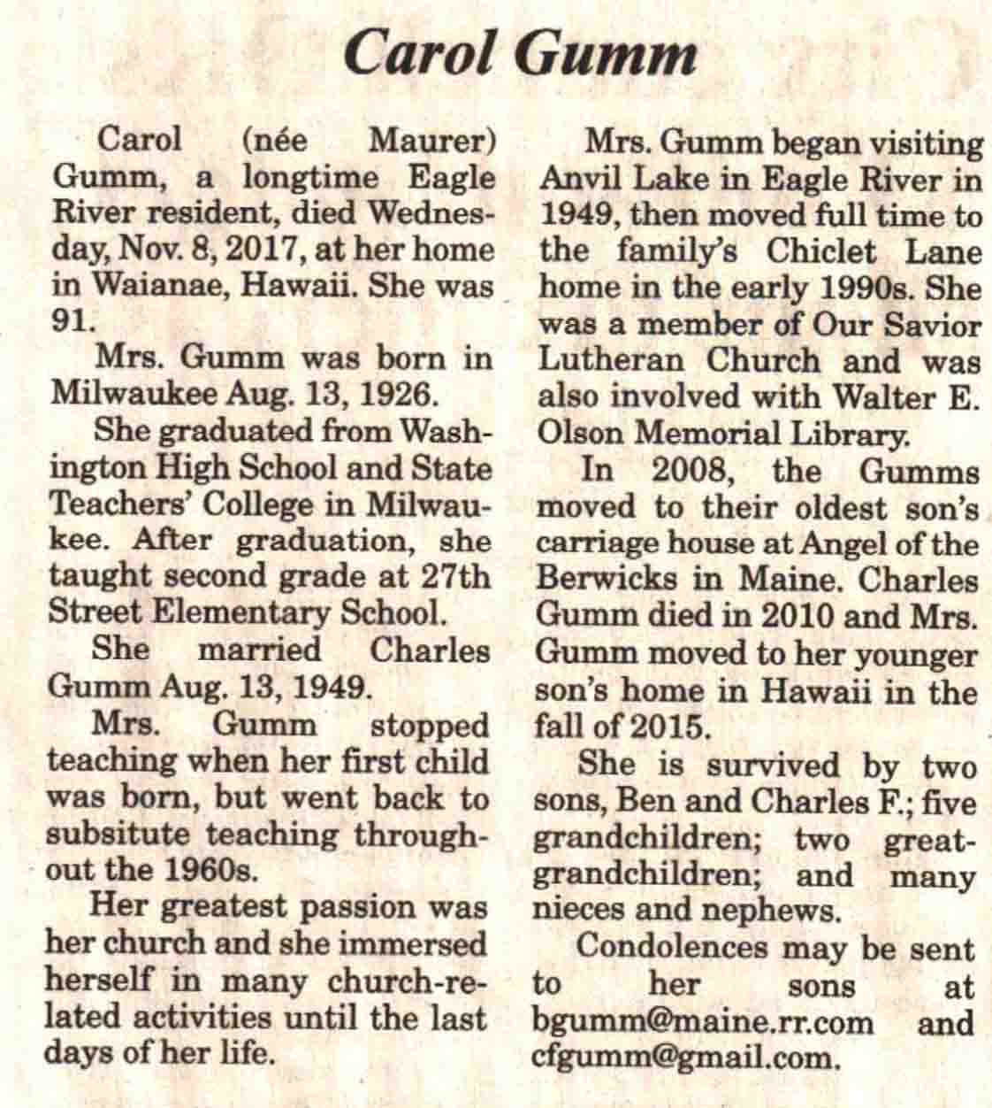| Gumm | Carol | 13 Aug 1926 | 08 Nov 2017 | V N-R | 06 Dec 2017 | 4 |