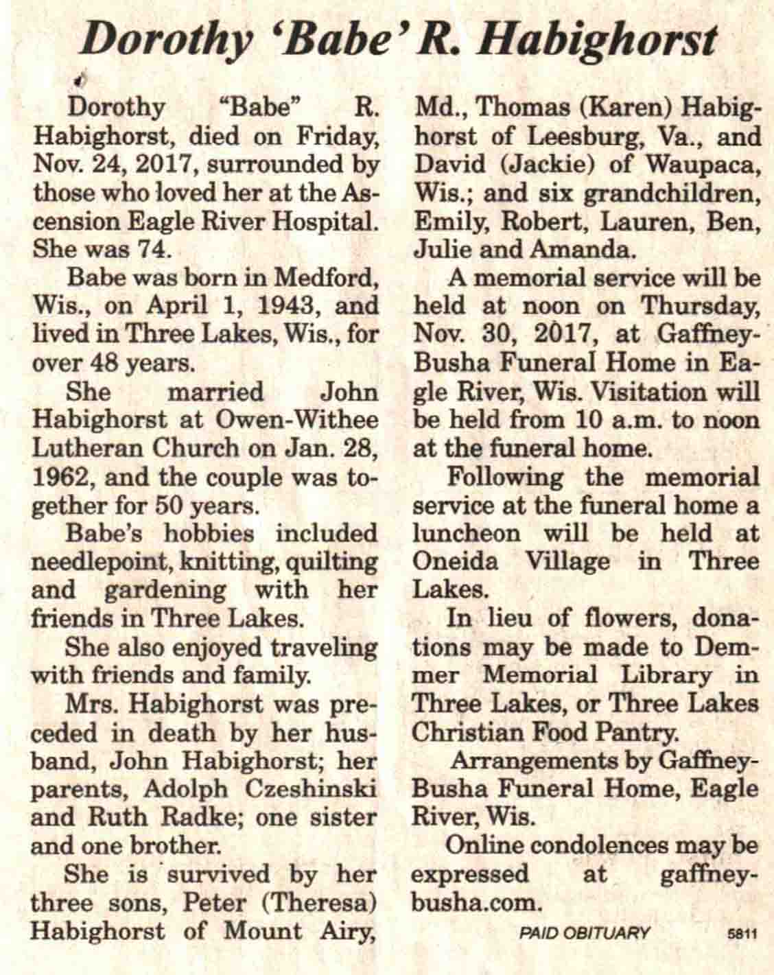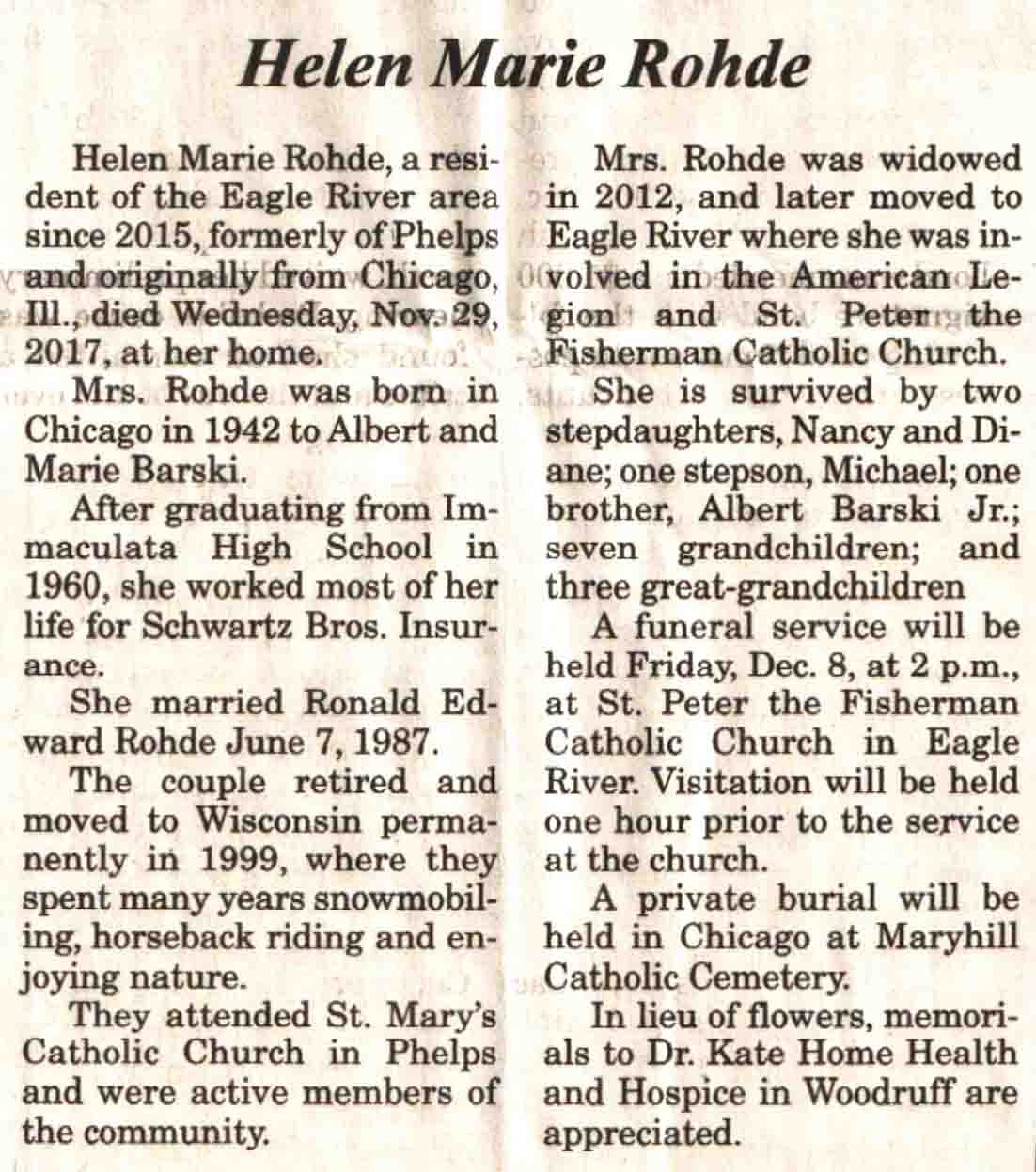 | Rohde | Helen Marie (Barski) | 1942 | 29 Nov 2017 | V N-R | 06 Dec 2017 | 4 |