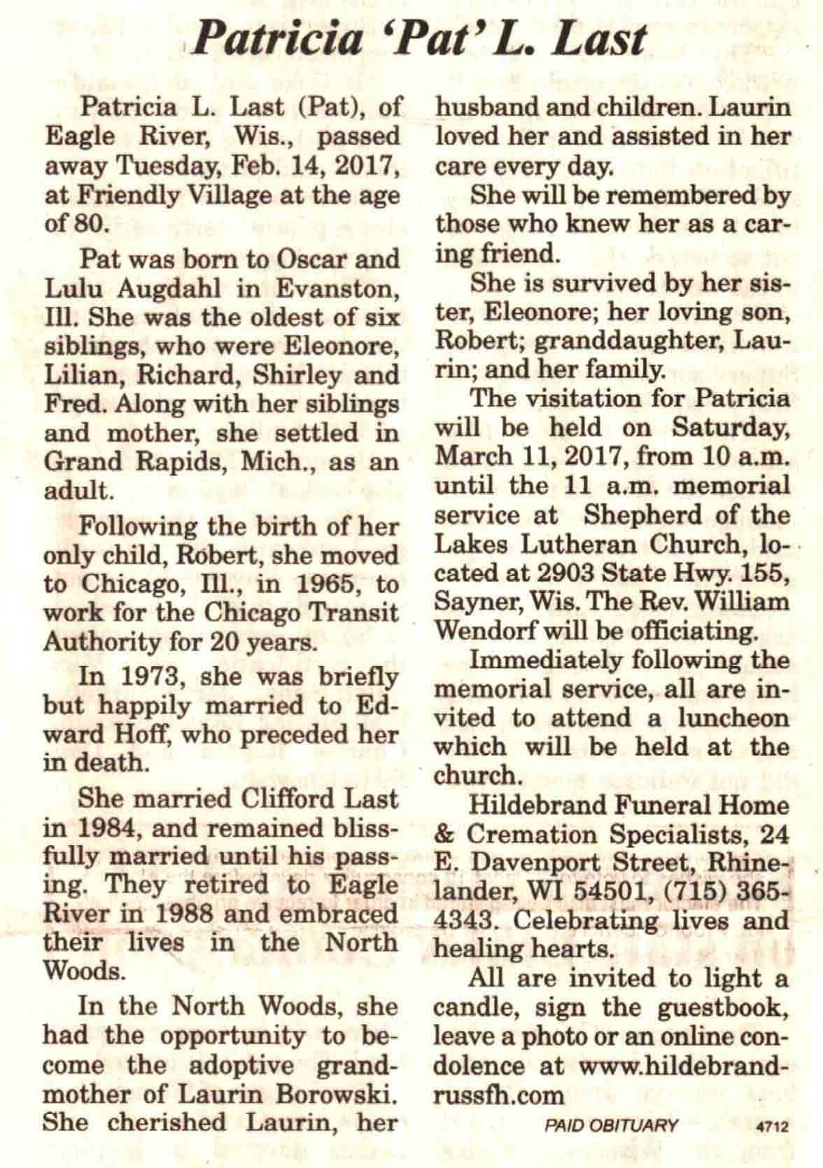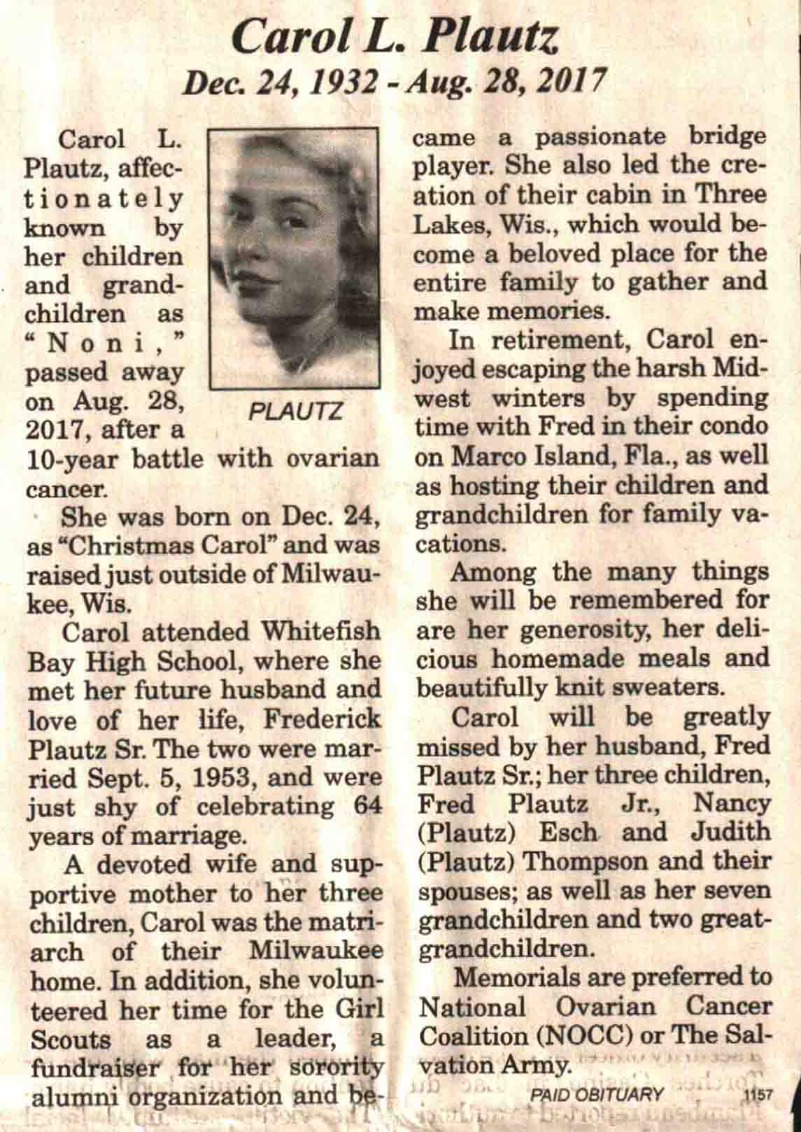 | Plautz | Carol L | 24 Dec 1932 | 28 Aug 2017 | V N-R | 04 Oct 2017 | 4A |