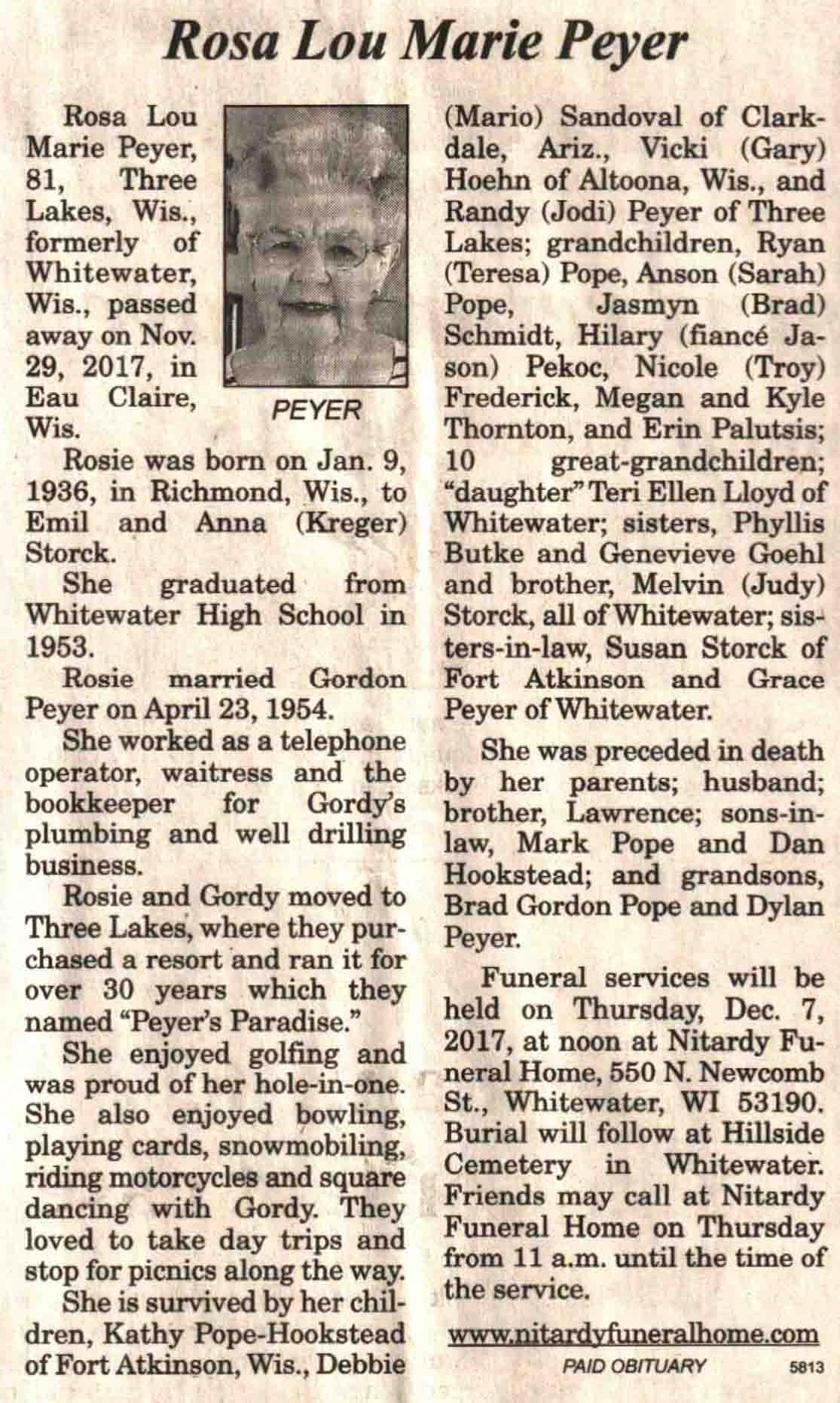 | Peyer | Rosa Lou Marie (Storck) | 09 Jan 1936 | 29 Nov 2017 | V N-R | 06 Dec 2017 | 4 |
