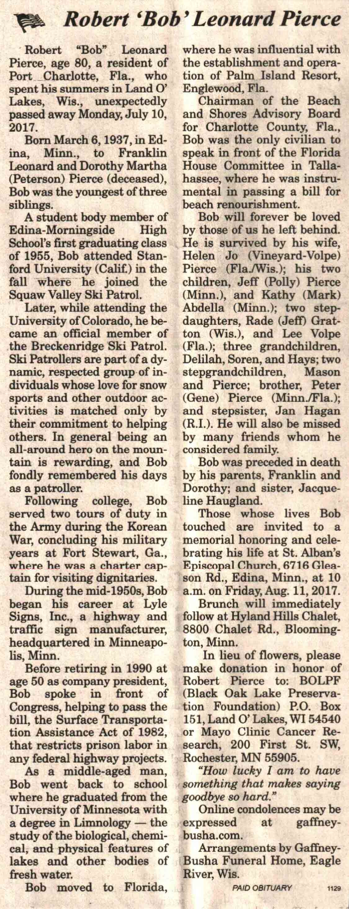 | Pierce | Robert Leonard 'Bob' | 06 Mar 1937 | 10 Jul 2017 | V N-R | 26 Jul 2017 | 4A |