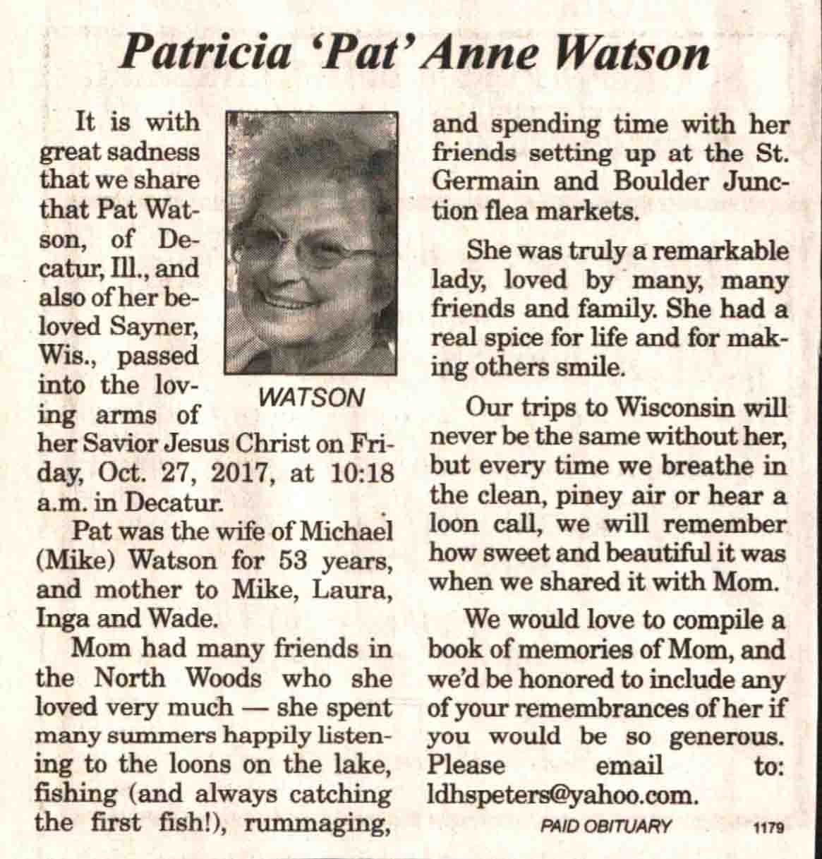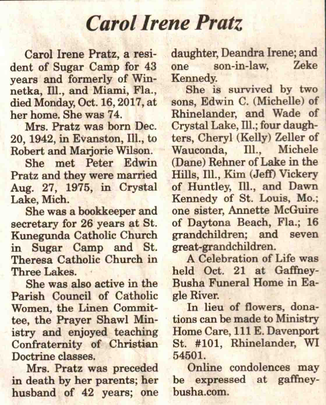 | Pratz | Carol Irene (Wilson) | 20 Dec 1942 | 16 Oct 2017 | V N-R | 25 Oct 2017 | 4 |